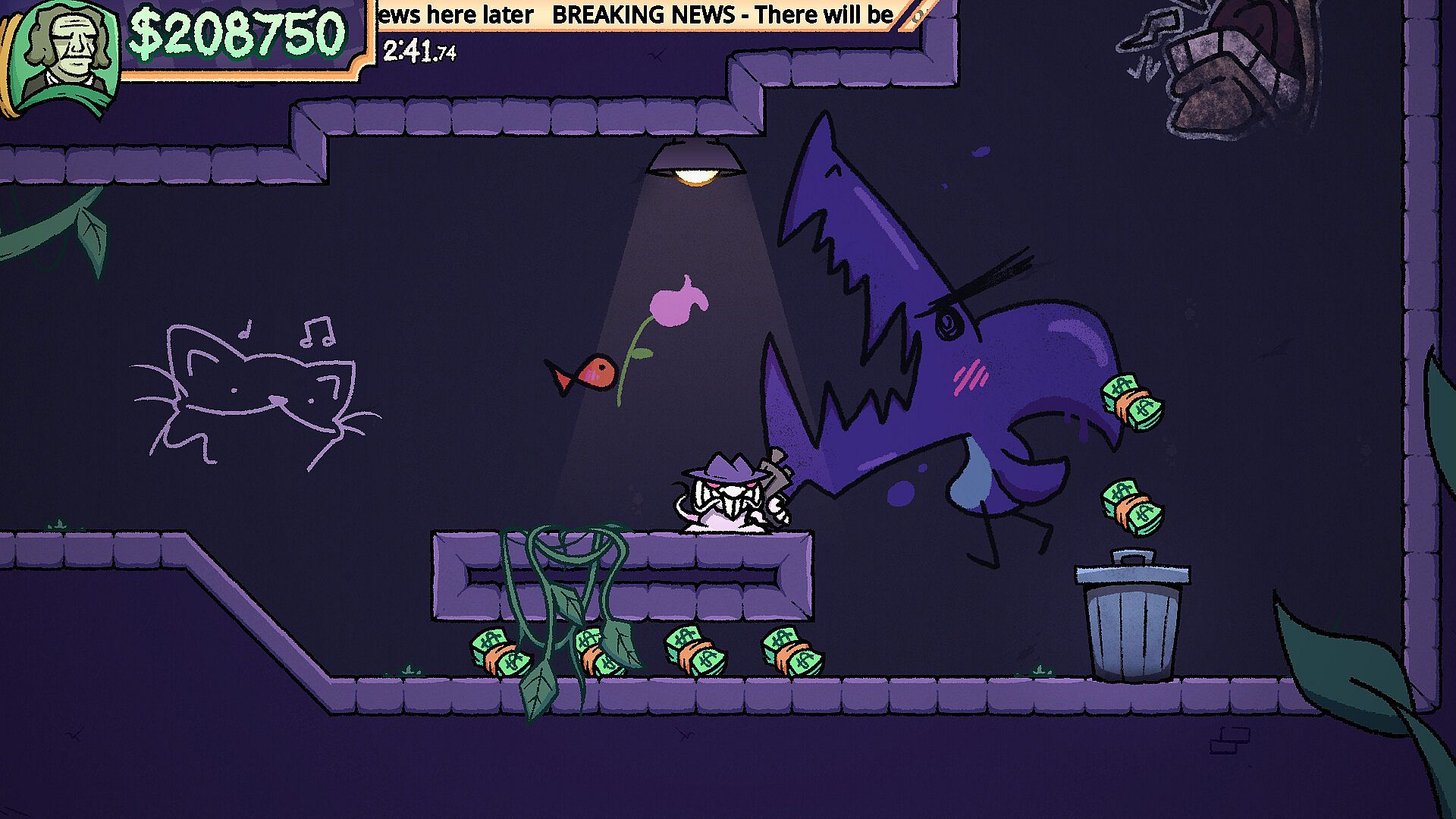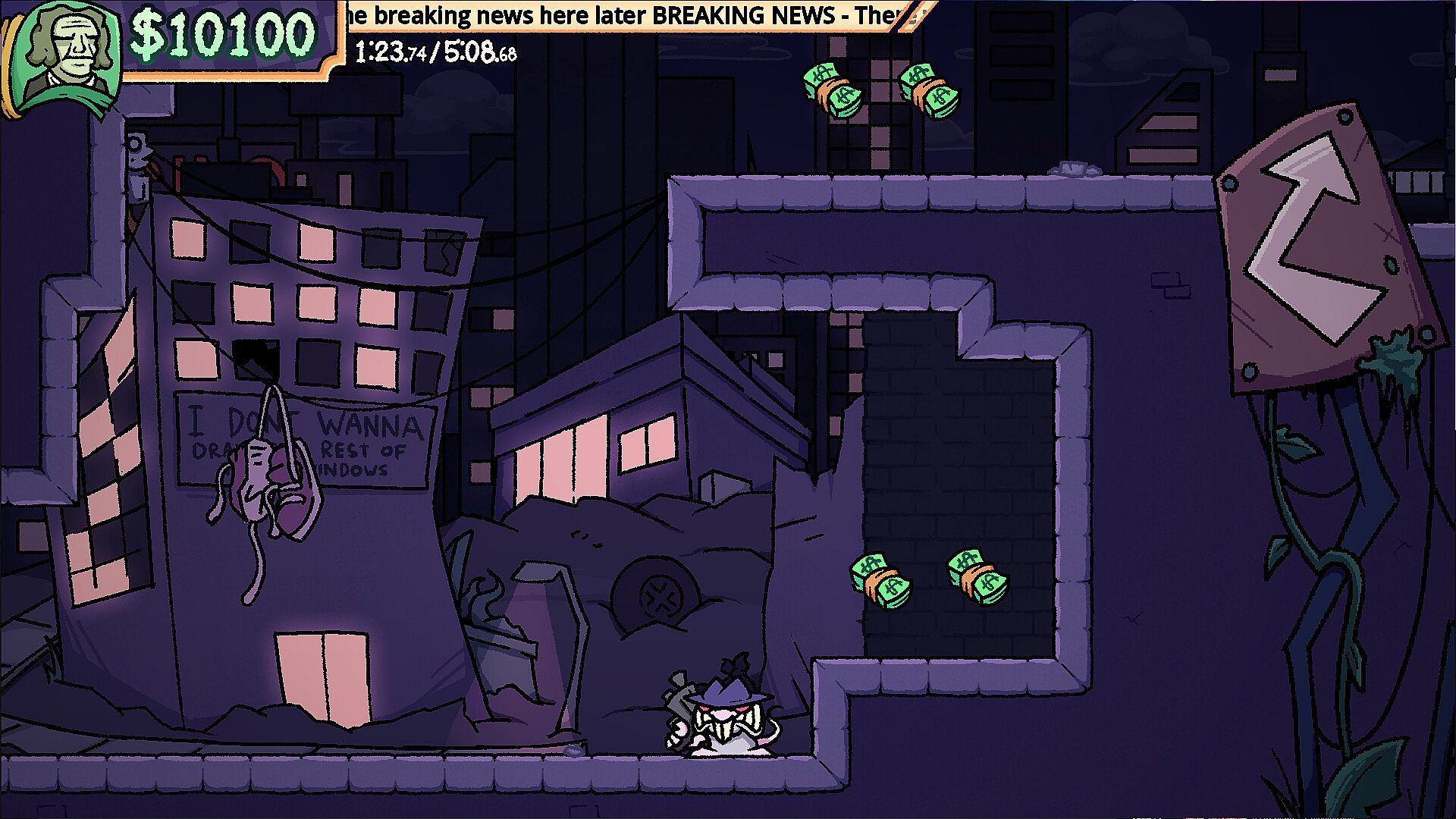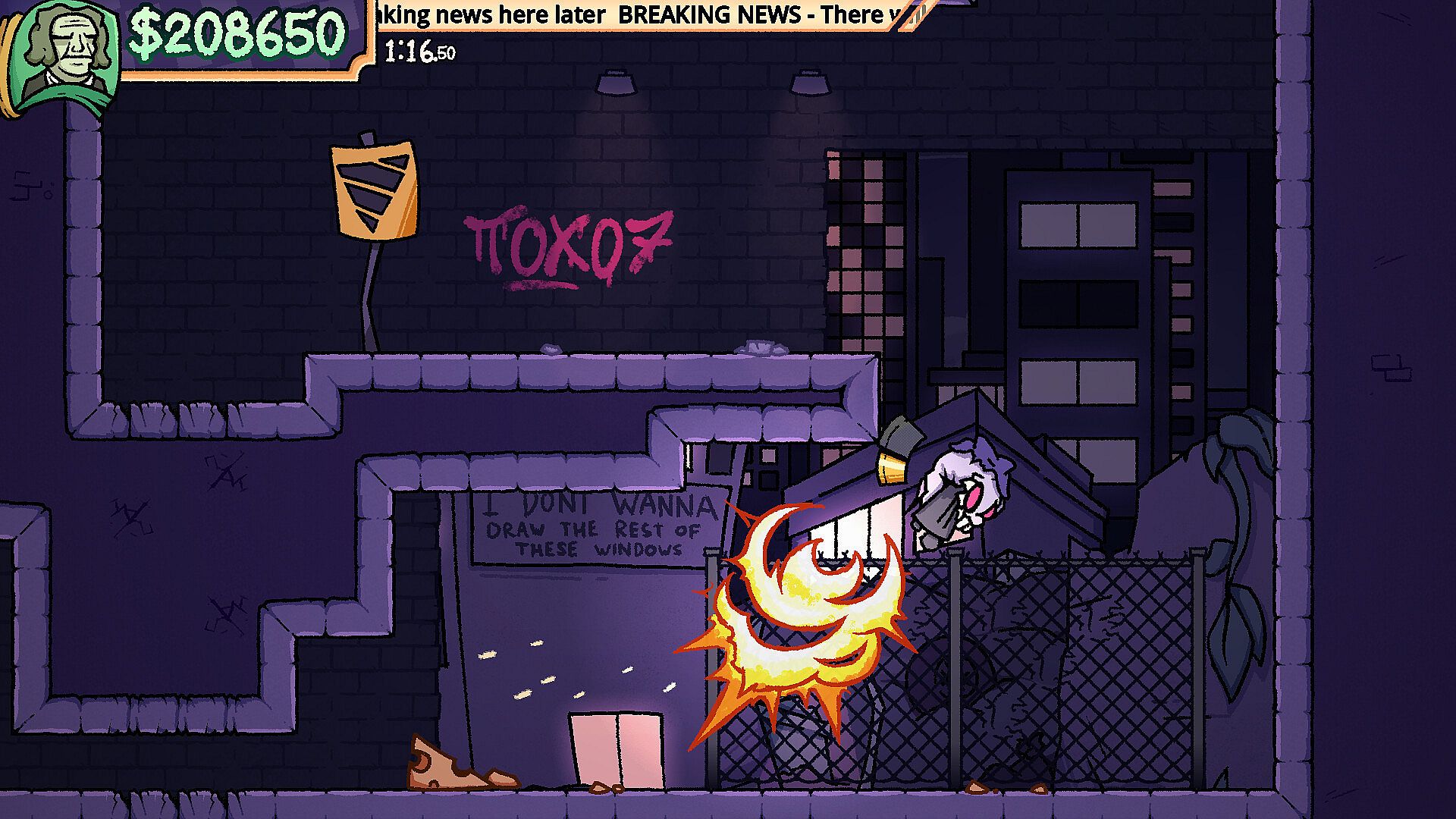 RATSHOT, as you can probably see, has a rough sketchy artstyle reminiscent of games on Newgrounds and graffiti. Speaking of graffiti, this game has a lot of it! If you stop to look around levels, you'll see lots of street art and graffiti tags. Maybe you'll even be able to paint some of your own...?