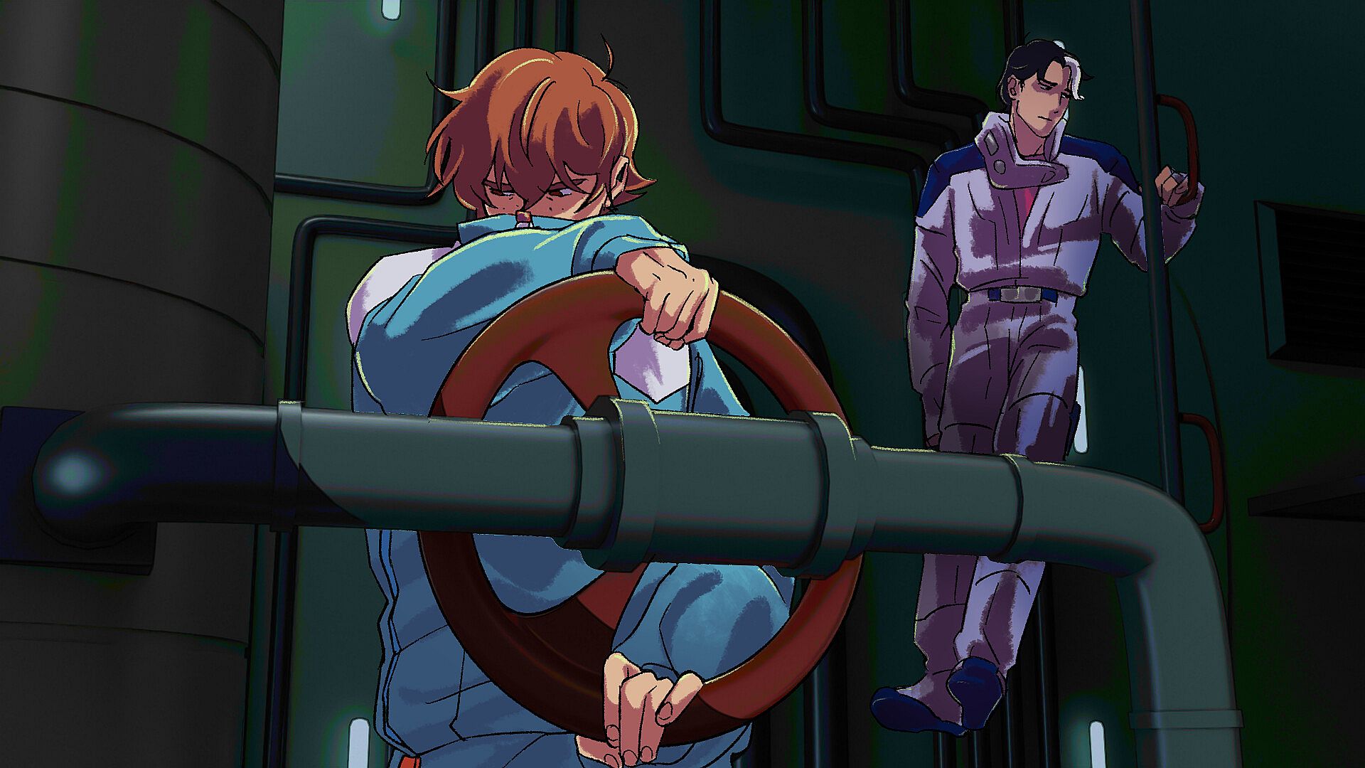 Narrative scenes unfold in a visual novel style with hand drawn character art in a deep space setting. During a scene you’ll hit a break in the conversation with a puzzle to solve made of mixed up sentences.