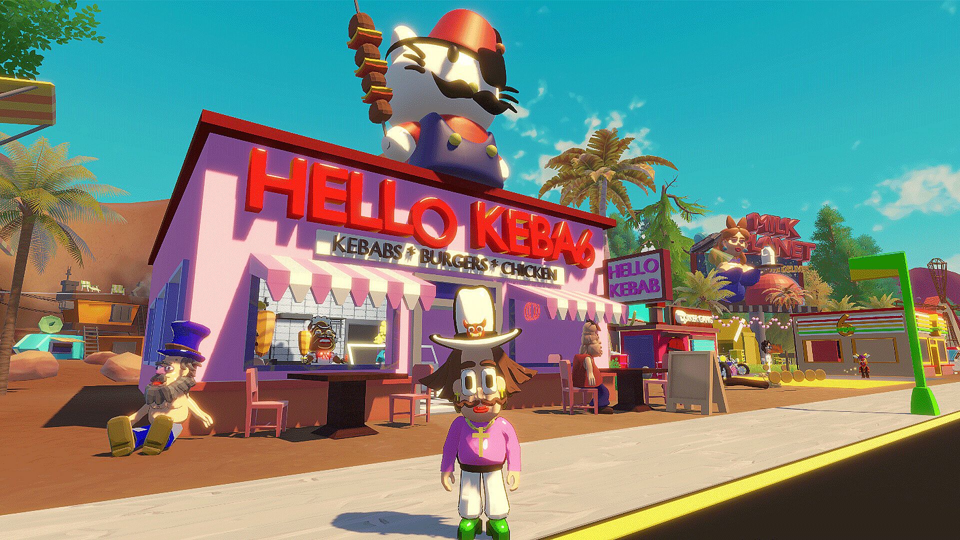 Ravy Davy is a chaotic 3D adventure game where you play as a washed-up rockstar trying to save the broken town of Ambiguity. Fight biker gangs, infiltrate satanic cults, collect kebabs, uncover a surreal conspiracy and take down OAP Margaret Doom! — all in a lo-fi cartoon world full of dark humour and deranged characters.