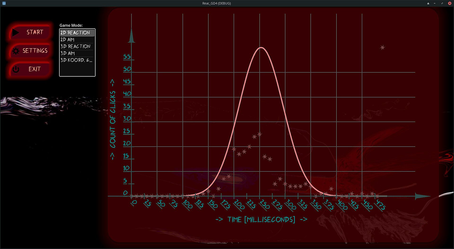 The reactions will be saved and can be reviewed. To present the reactions a distribution diagram for each mode can be found in the menu. In the distribution diagram the X-Axis represents the reaction time and Y-Axis the count of reactions.
