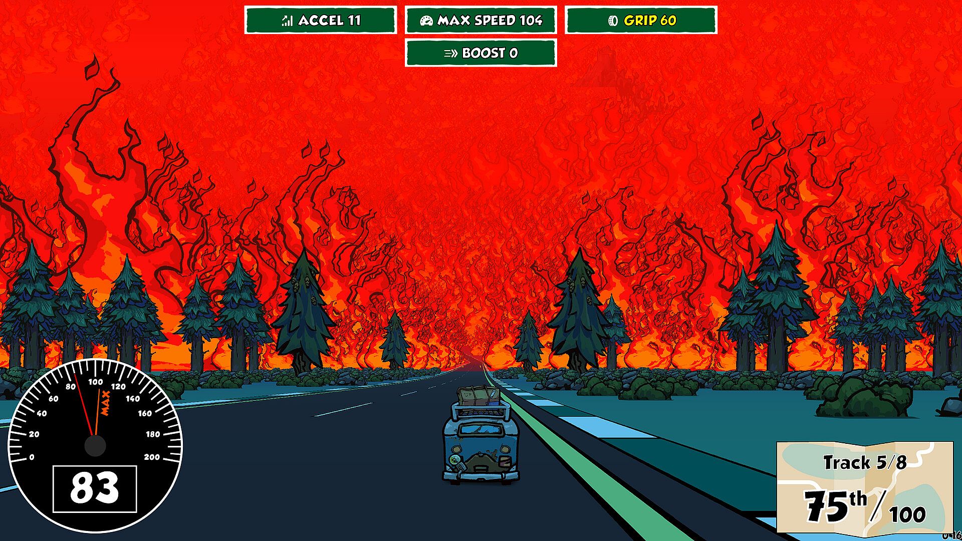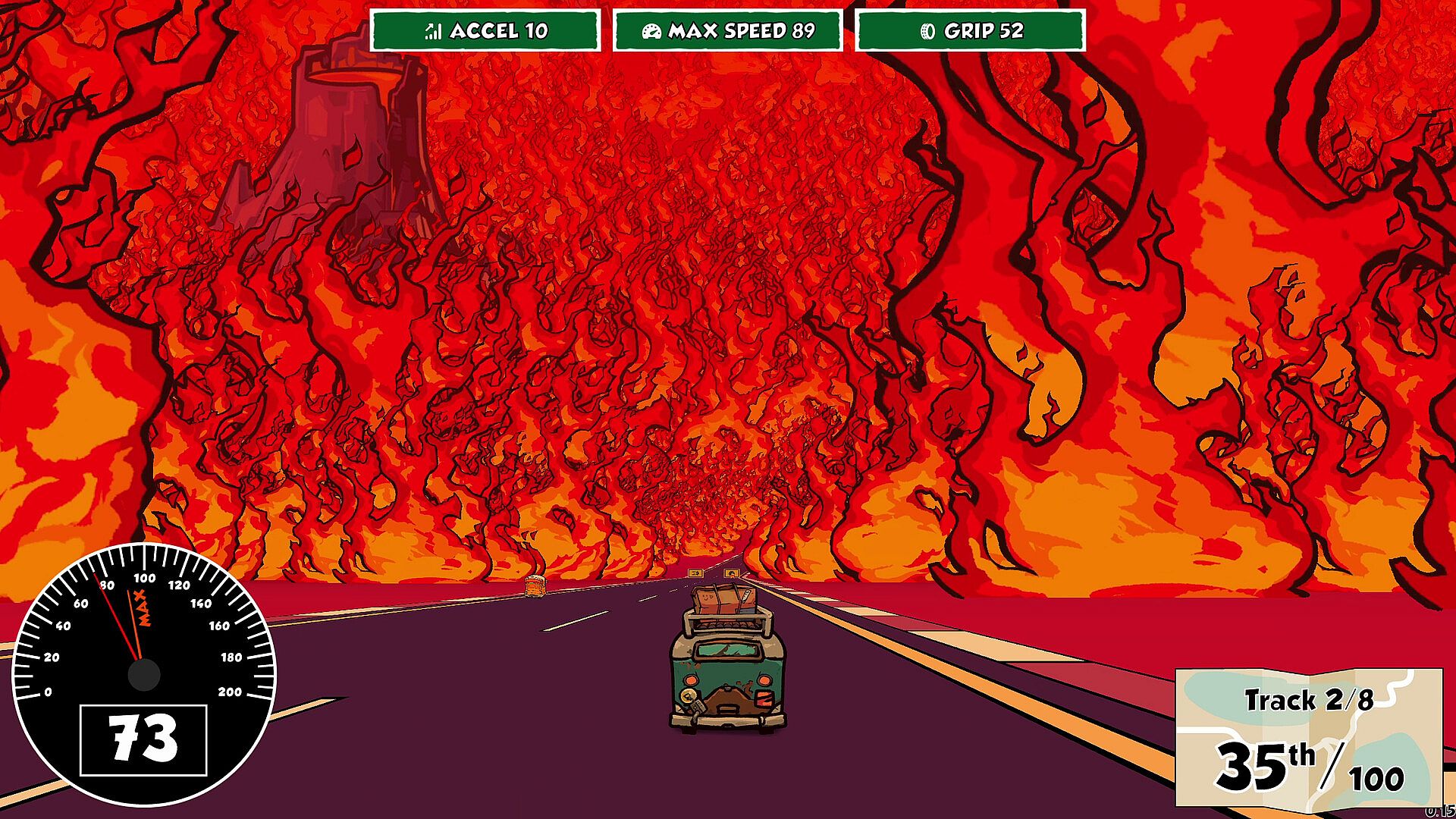 Some missions include roguelike deckbuilding, where you have a deck of cards which have effects while drawn. In addition to upgrading your car using the core stats, you'll choose new cards to add to your deck.
