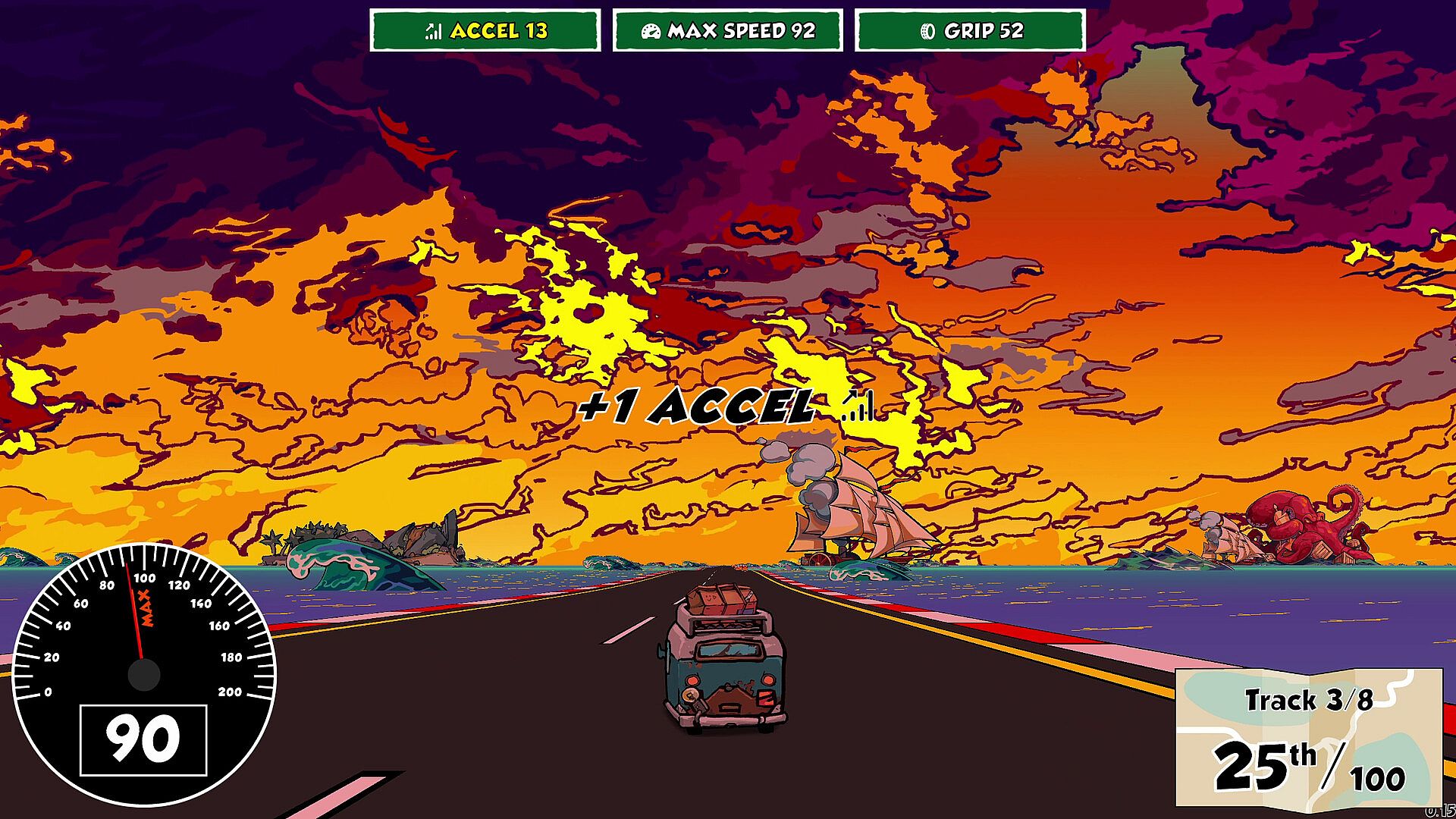 You'll start each race with a fixed set of stats for ACCEL, MAX SPEED and GRIP. Each time you're offered a choice for the next track, each option will be linked to a stat upgrade. Certain combinations will synergise with each other, or with your current stats!