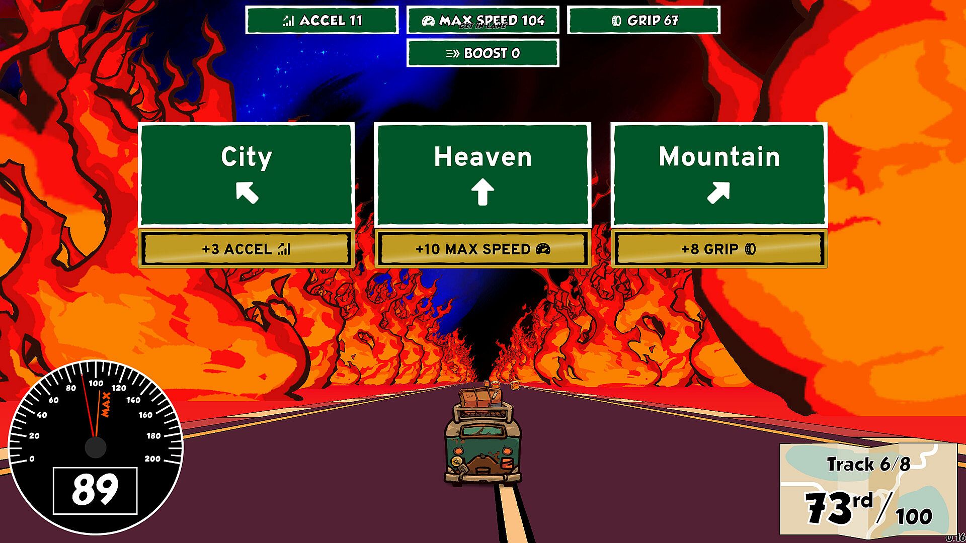Drive through a series of strange worlds, racing to be the first to deliver packages to obnoxious godlike creatures who have nothing but disdain for you. At the end of each track, choose between three options for a new track - you'll decide based on your stats and the linked upgrades being offered.