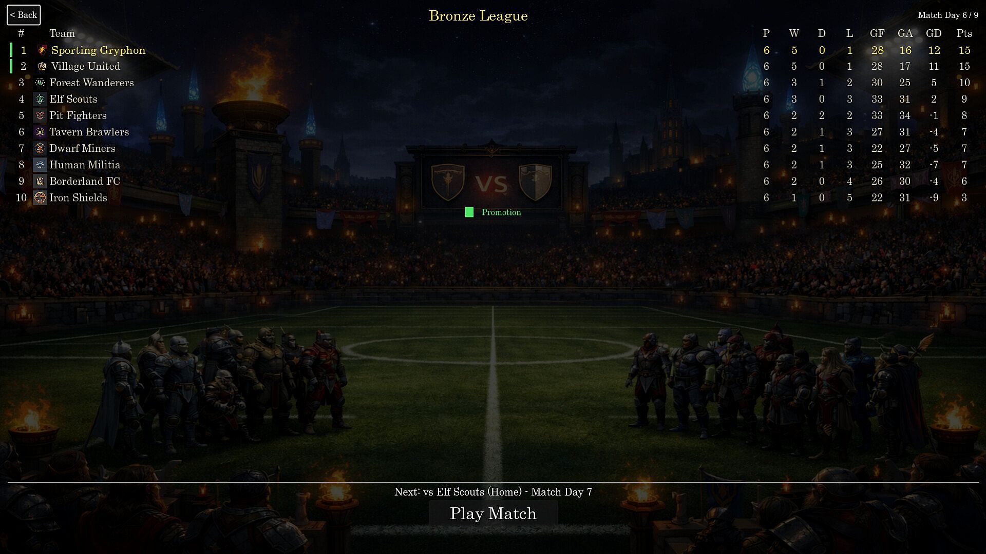 Start in the Bronze League with a squad of Commons drafted at the start of your journey. Play a full 9-match round-robin season against themed AI opponents. Finish in the top 2 to earn promotion through five tiers: