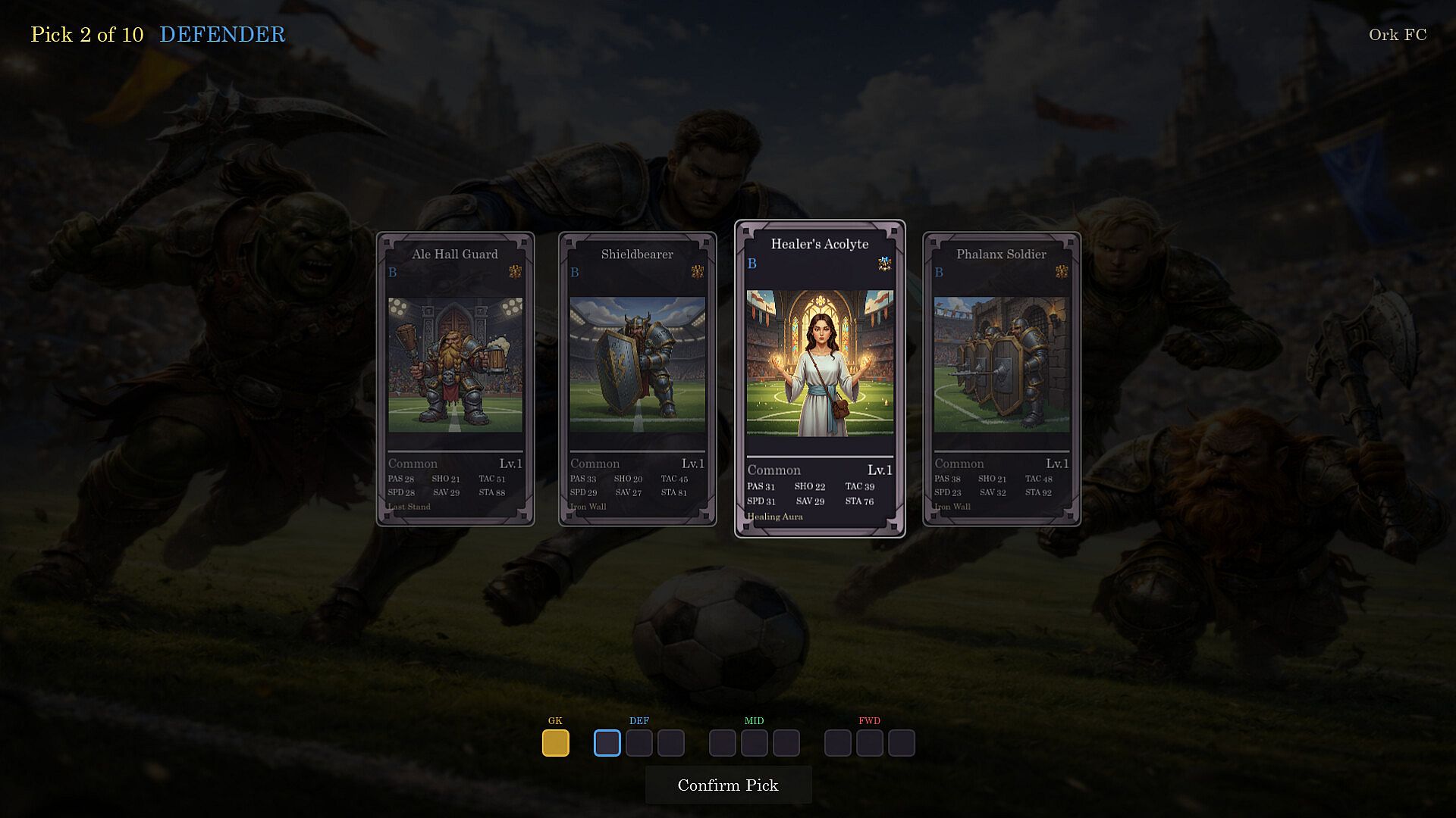 Realms Cup is a single-player fantasy football card game where Orcs, Elves, Dwarves, and Humans clash on the pitch. Collect 120+ unique cards, build synergistic squads, and watch your team battle through leagues and tournaments in simulated matches.