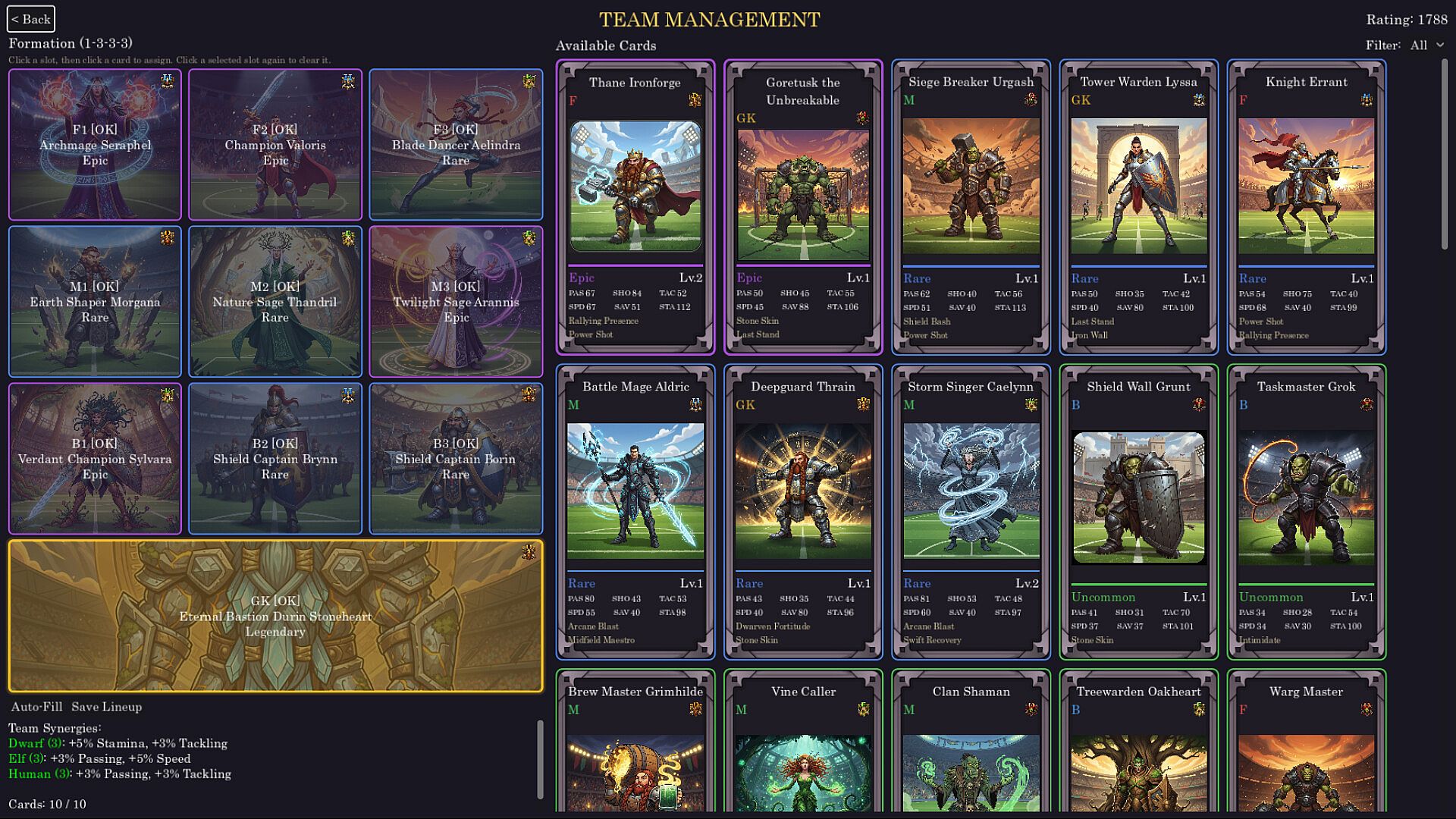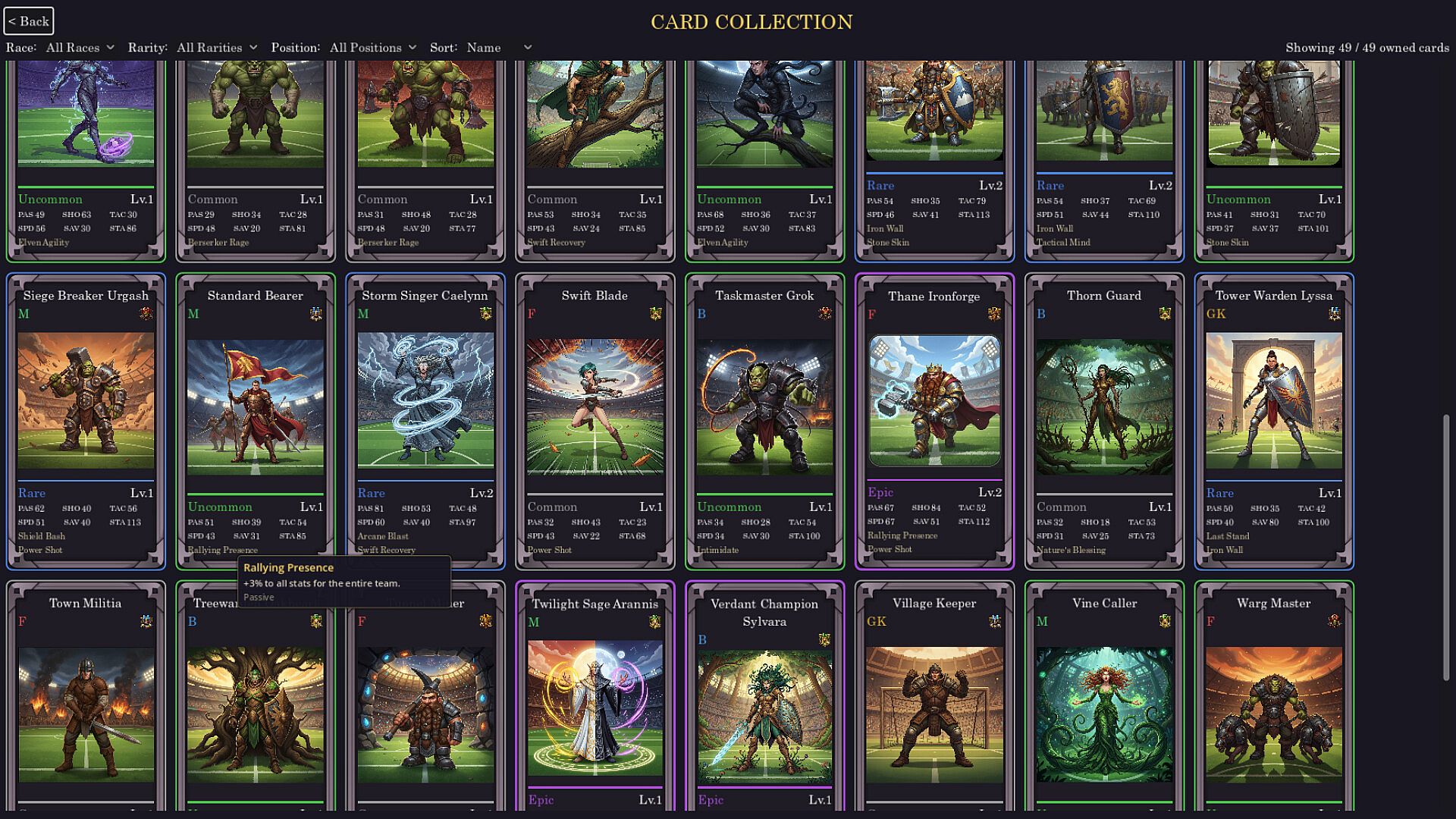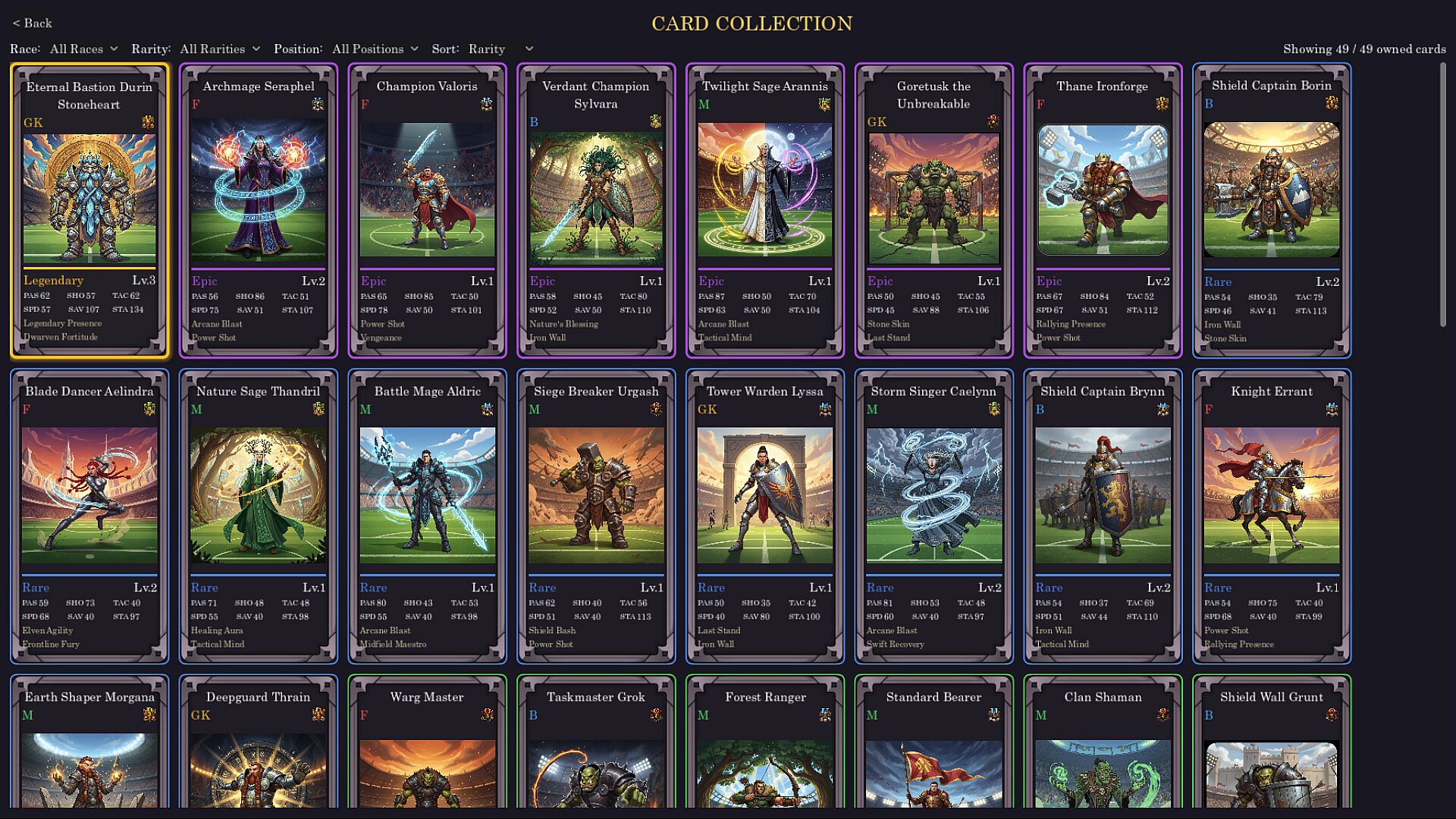 From humble Commons to game-changing Legendaries, every card has unique stats, abilities, and identities. Open packs from the shop — Bronze, Silver, Gold, or race-specific packs to target the synergies you need. Duplicate cards grant XP to level up, making even a familiar pull a step toward a stronger squad.