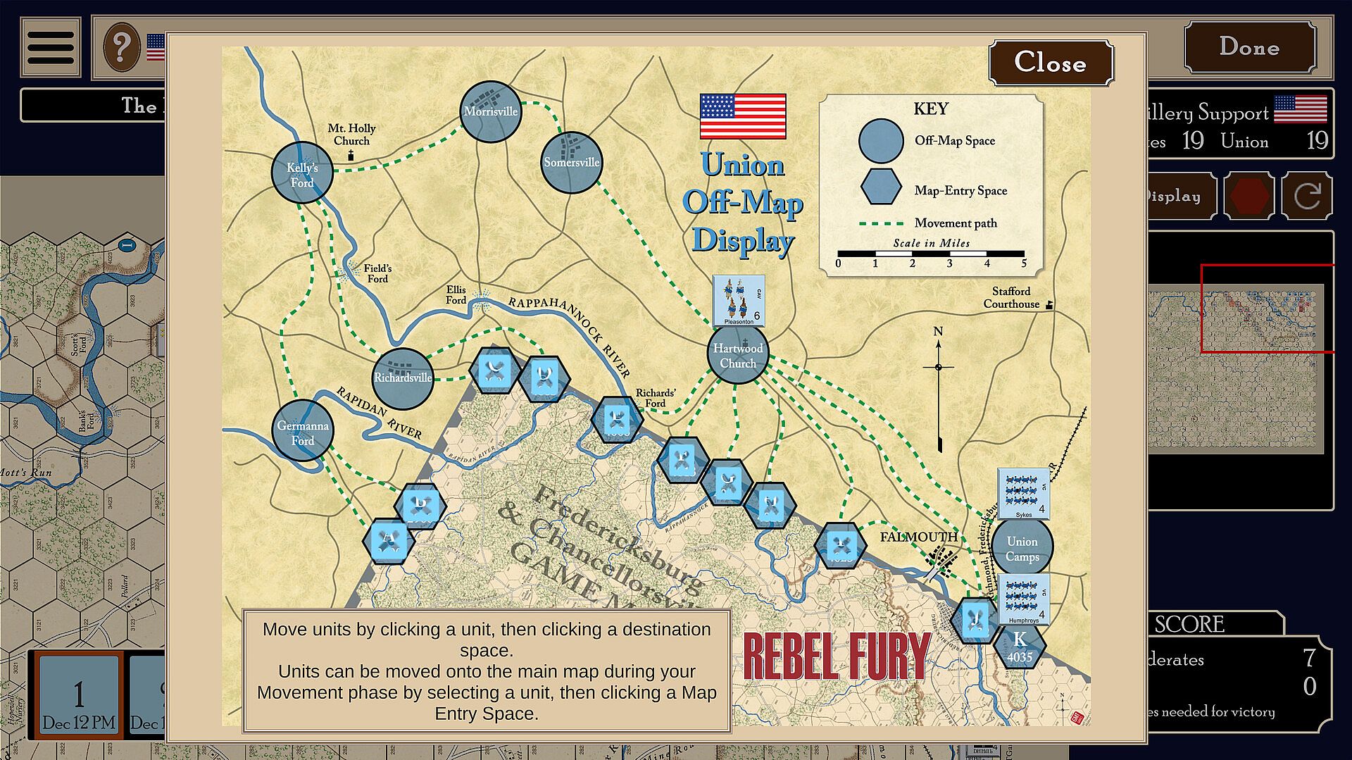 Rebel Fury is a solo or two-person turn-based strategy wargame based on the Rebel Fury boardgame created by the legendary game designer Mark Herman and published by GMT Games. The game includes six historical battles: Fredericksburg, Chancellorsville, Chickamauga, Chattanooga, the Battle of the Wilderness and Spotsylvania.
