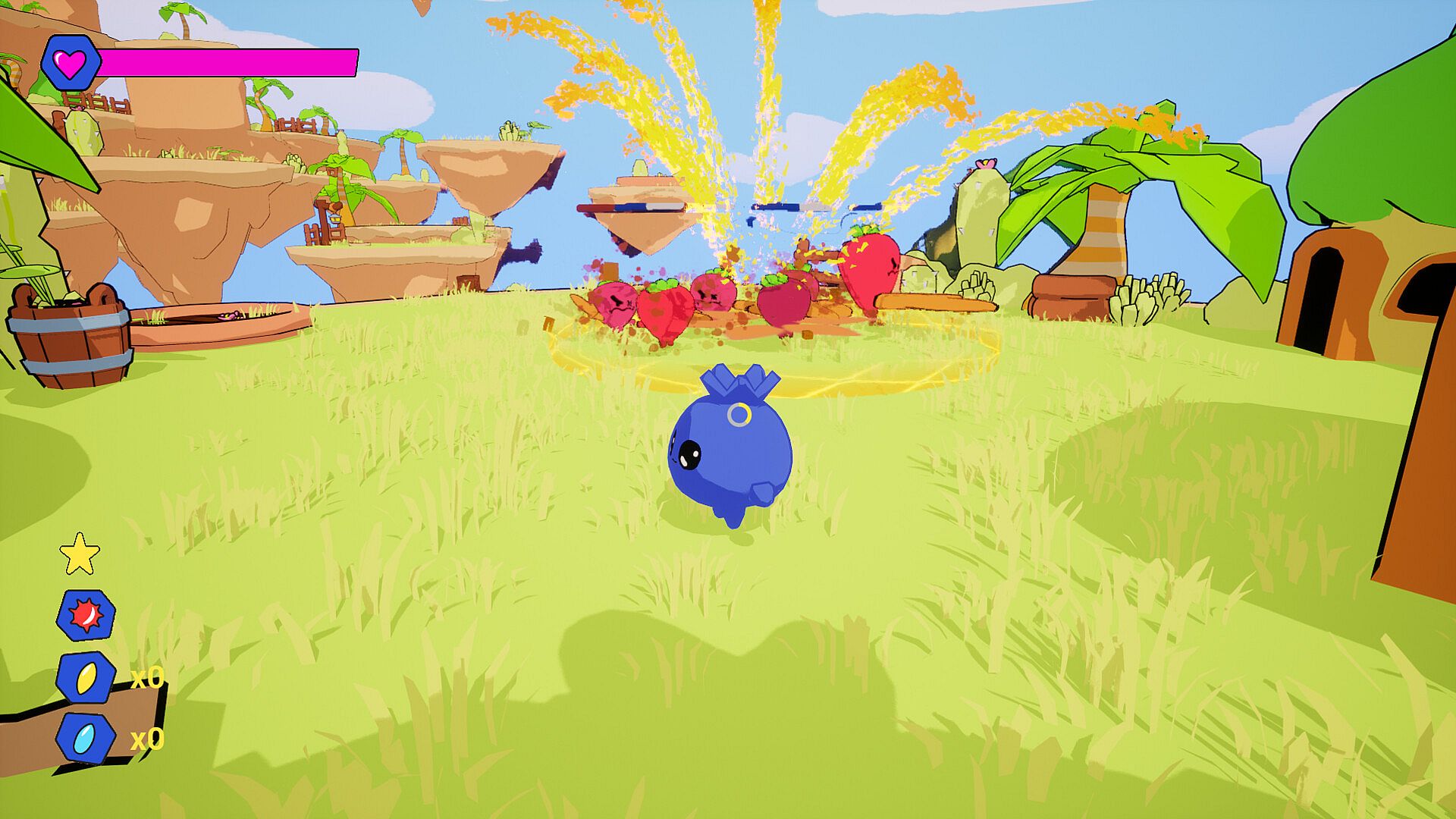 An action strategy war game set in a cutesy fruity wonderland that combines 3D platforming with RTS elements