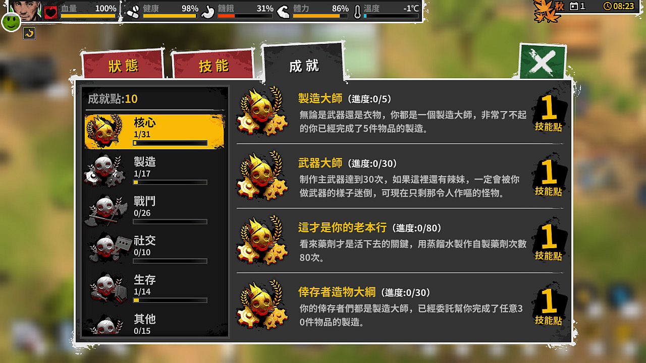 遊戲世界中的你可以不斷消滅敵人,拯救倖存者,建造營地,製造裝備來獲得成就,通過成就提供的技能點數來強化自己對於戰鬥,防守以及生存探索的各方面能力。