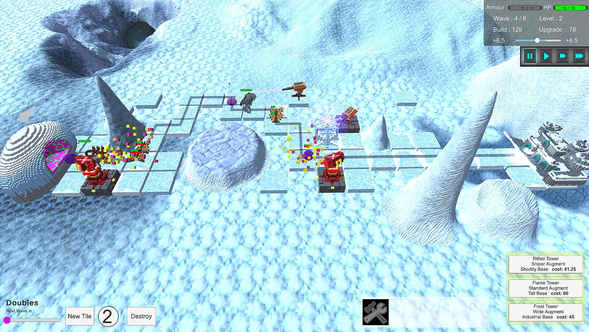 Configure towers from a set of archetypes combined with various augments and bases, allowing greater customization to fit what you need. These augments and bases can alter your towers' speed, range, damage, and even affect how the tower fires.