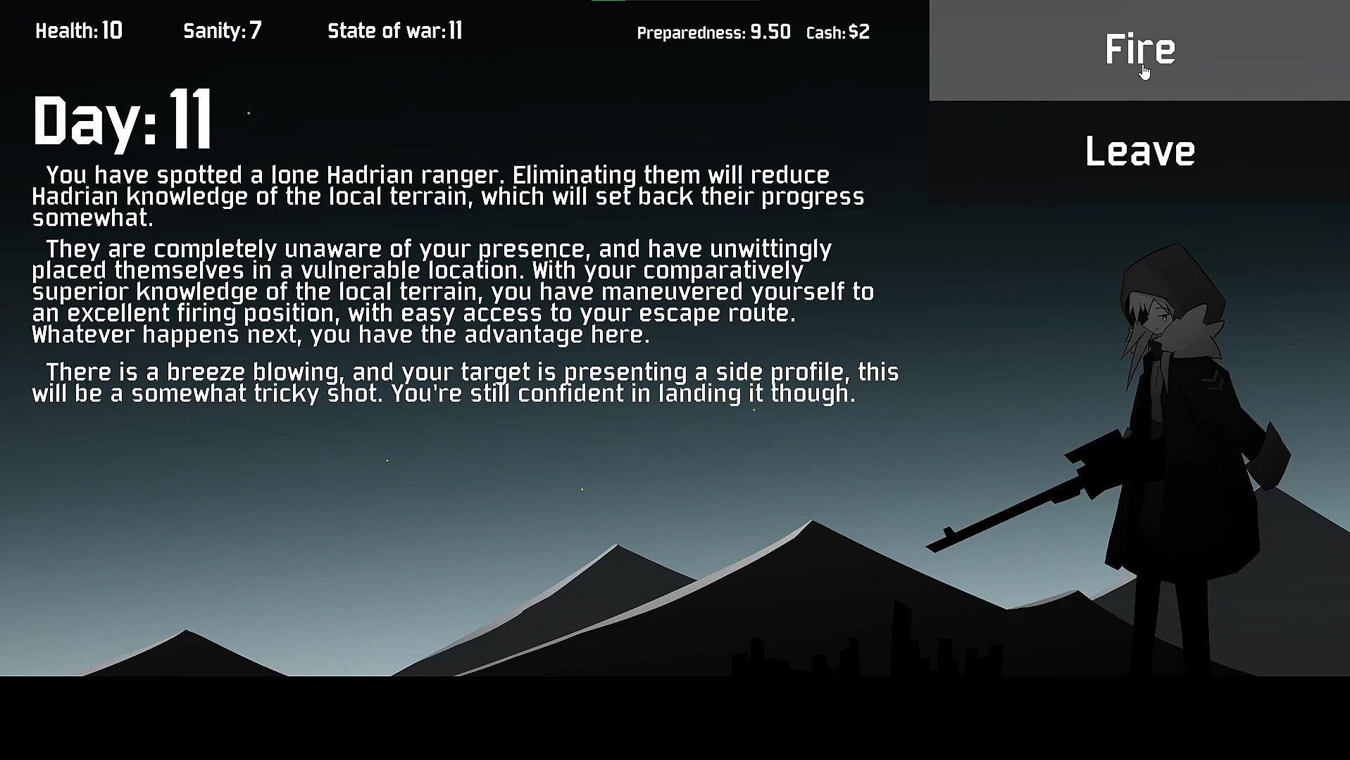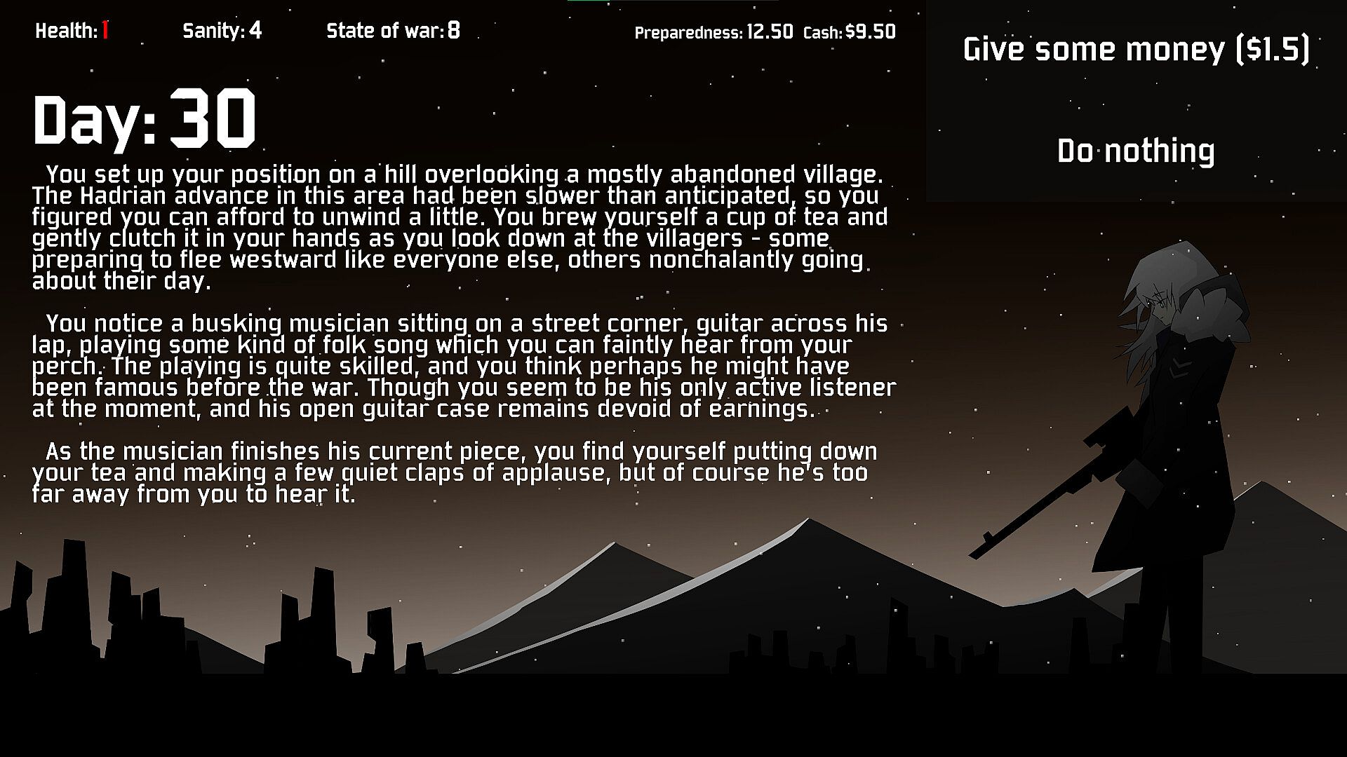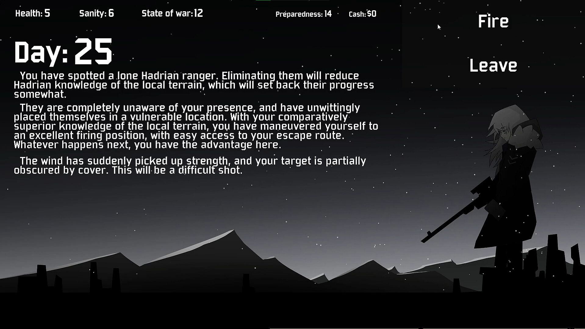 On your back lies a small saving grace: a state-of-the-art imported bolt action sniper rifle, far superior to any domestically manufactured equivalent. You forgot exactly how it fell into your hands in the midst of the chaotic rout. And despite everything, part of you wished its previous owner was still alive.