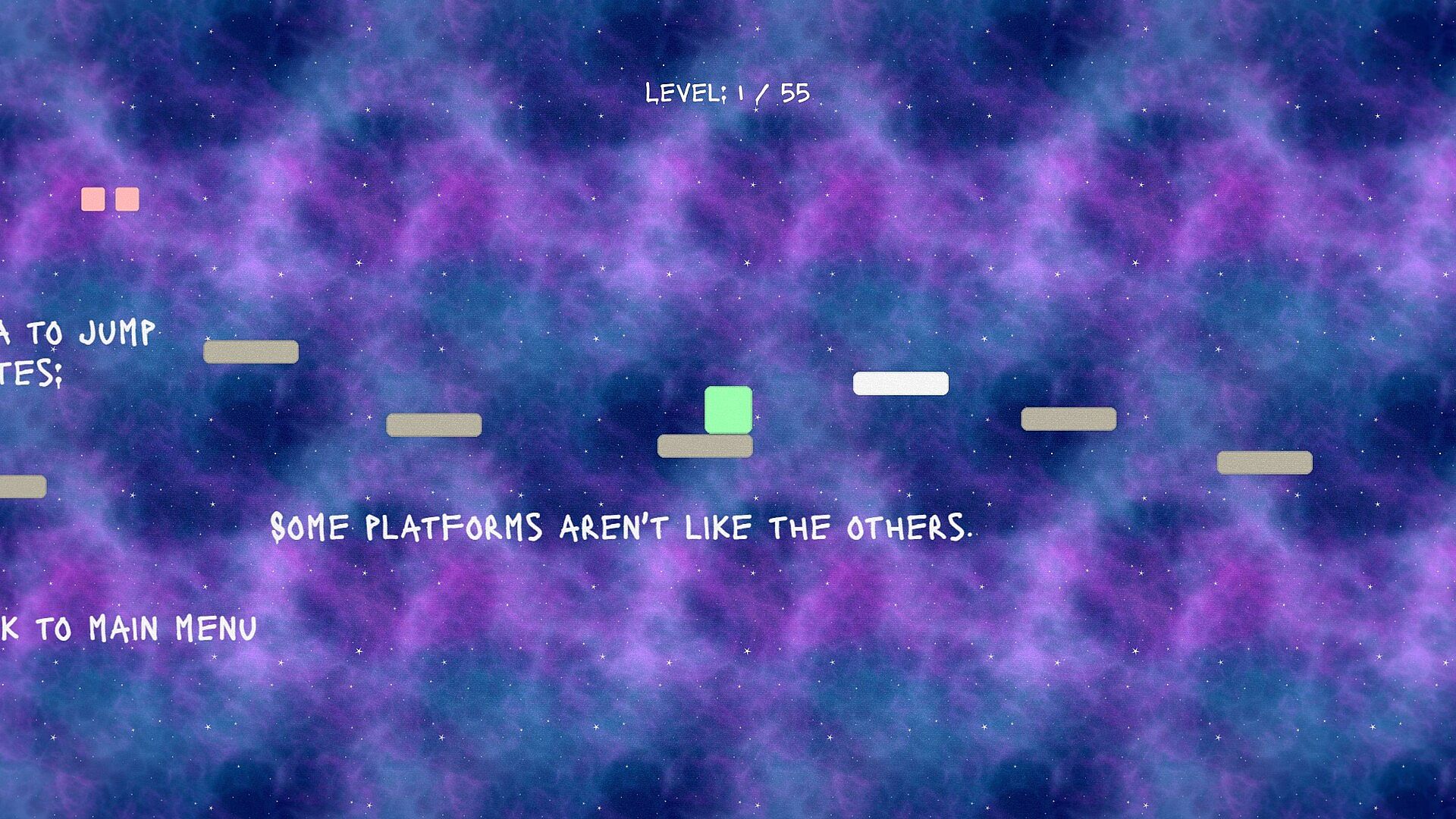 The game features 55 handcrafted levels, each more challenging than the last. You’ll solve puzzles, master tight jumps, and adapt to new mechanics — such as disappearing platforms, and color-based blockades.