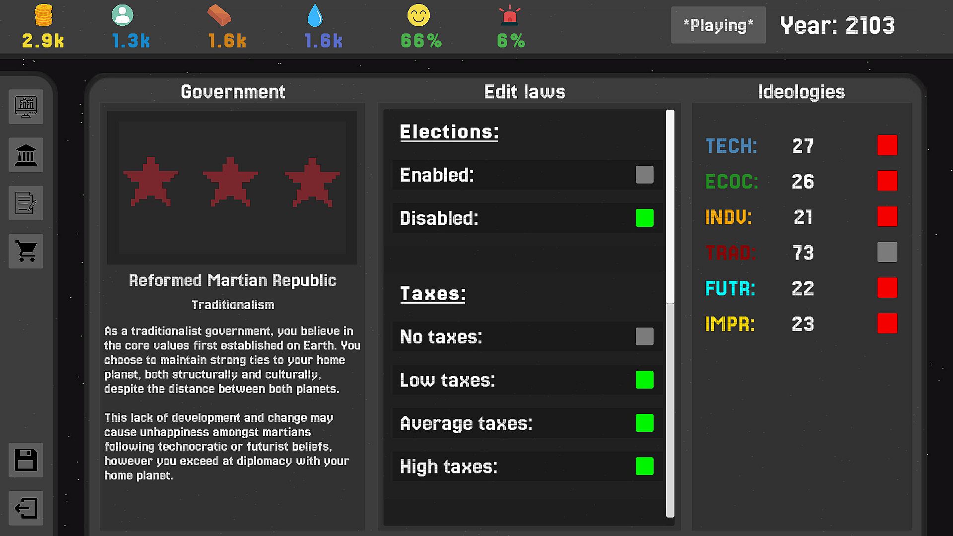 • Statistics such as planet happiness and crime