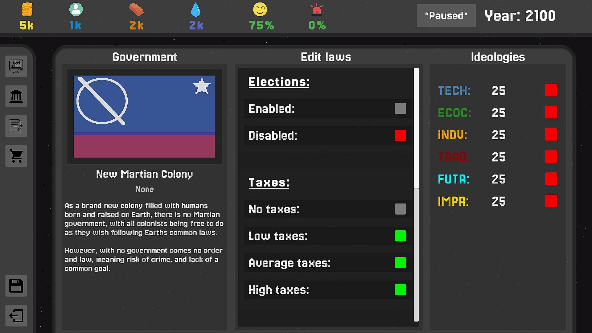 Red Horizon: Mars is a simplistic, yet strategic Mars colonization simulator, where you make decisions that impact humanities last hope. Set in the distant future, it is up to you to instate a government, promote laws, and manage your colony in Mars. Choose your destiny - do you succeed in turning Mars into a succesful, habitable planet? Do you turn Mars into a technological superpower? That is your choice to make when playing RHM.