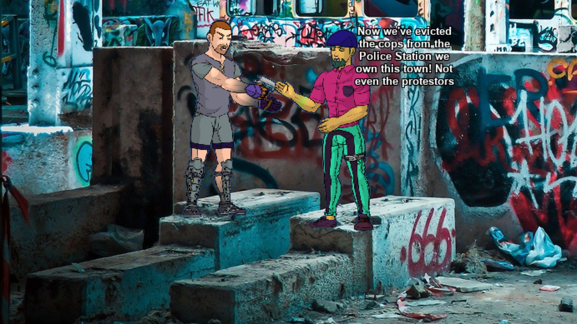 In this side-scrolling platform shooter, you play John Ombar: a traumatized war veteran who is trying to settle into civilian life with his wife, Jenny. When the city's residents and law enforcement agencies are distracted by widespread protests, a deeply entrenched gang of law-breakers seizes upon the opportunity to take control of the city. Suppressing all opposition with violence and threats, the gang is free to execute its drug-peddling, gun-running and more.