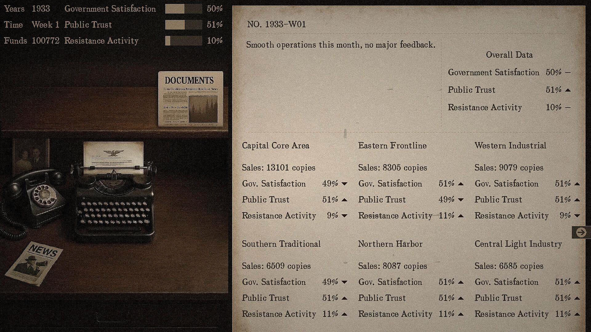 Minimalist yet Oppressive Art Style: Creates a tense, rigid, and conspiratorial newsroom atmosphere.