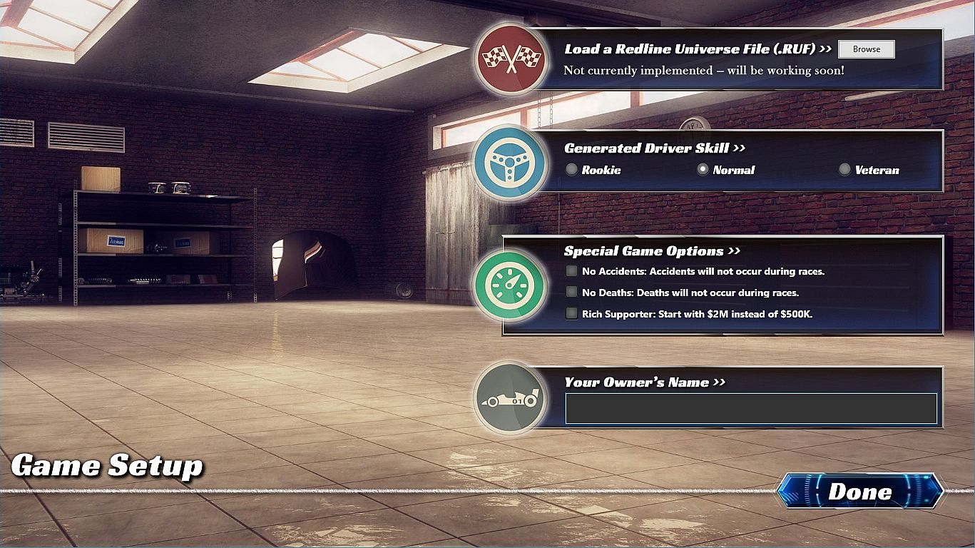 Ever dreamed of owning and managing your own car racing team? Redline Ultimate Racing allows you to make your dreams come true! Take control of either a randomly generated racing universe (complete with cars, sponsors, tracks/schedule, drivers and crew chiefs) or load your own custom-created universe into the game.