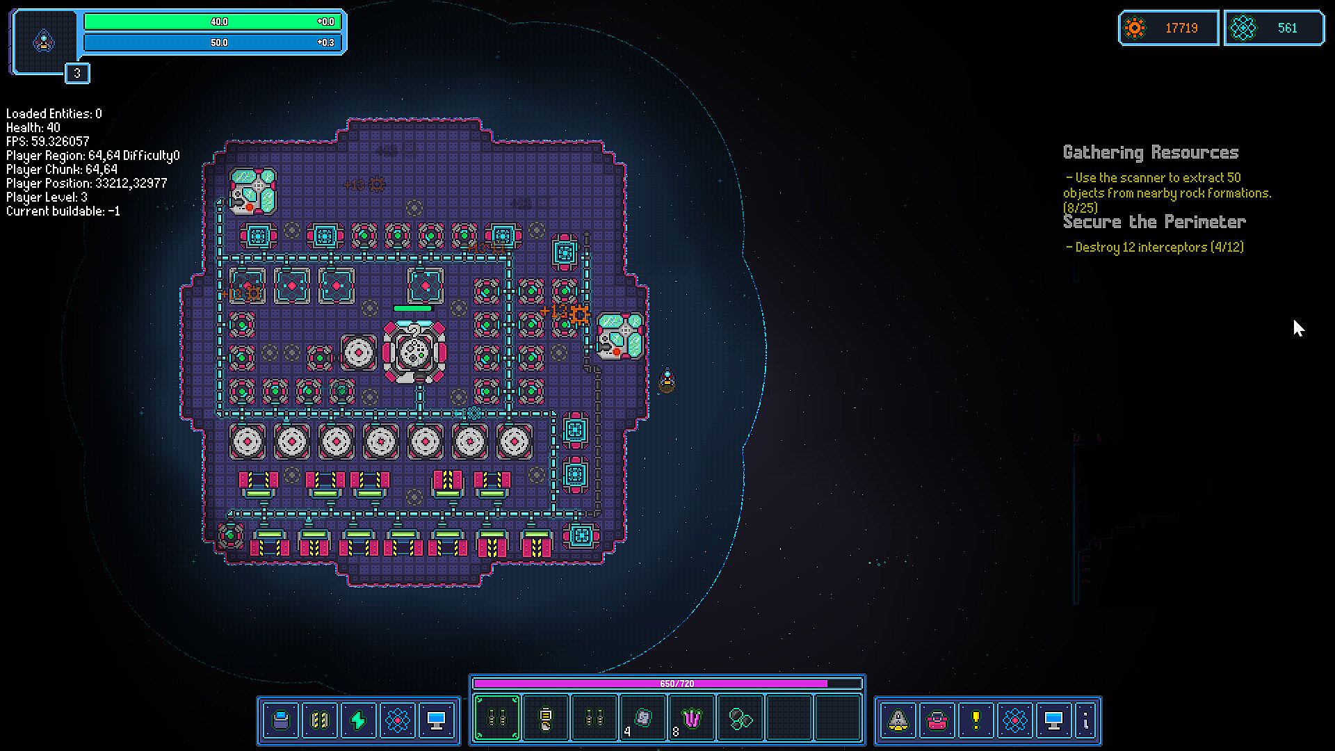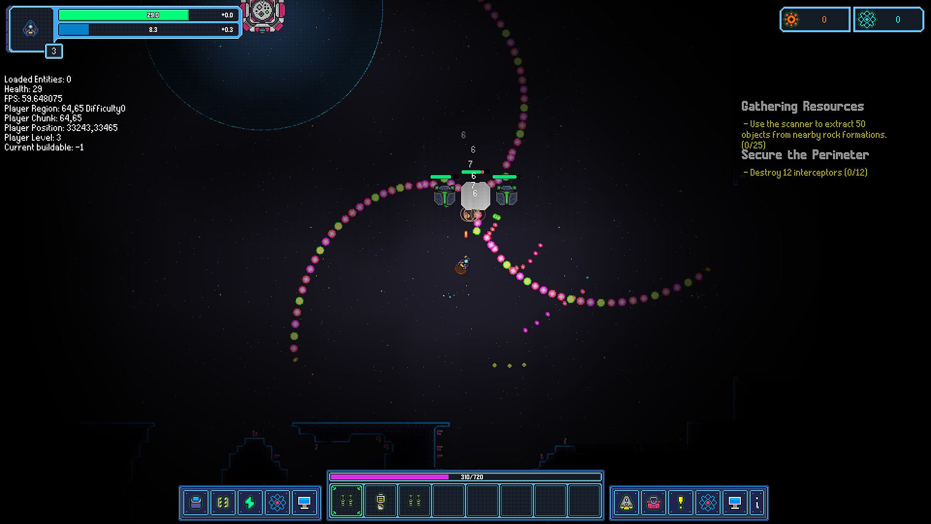 Regolith is a space RPG where you explore, build structures, design infrastructure, craft items, gather materials, and battle enemies you encounter. In the beginning you will be doing these things manually, but slowly you will develop technology to scale up production, automate supply chains and manage massive systems. Careful base layout will be essential to maximize efficiency and ensure all your needs are met.