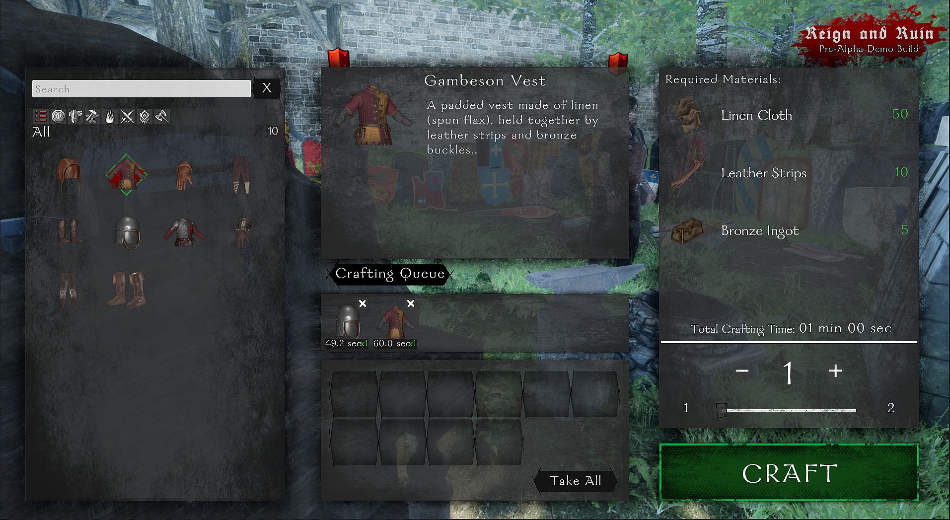 Our goal with Reign and Ruin’s crafting system is to bring the medieval professions to life. You can utilize historically accurate crafting and production stations such as tanneries, looms, forges, smithies, granaries, apothecaries, fletchers/bowyers, baking ovens, chandleries, bee skeps, siege engineer-shops, and much more. Harvest resources to craft tools, weapons, armor, and building materials. Refine your raw resources in refining stations and craft them into useful items at the appropriate production station. Progress to crafting higher-tier items by upgrading your production stations.