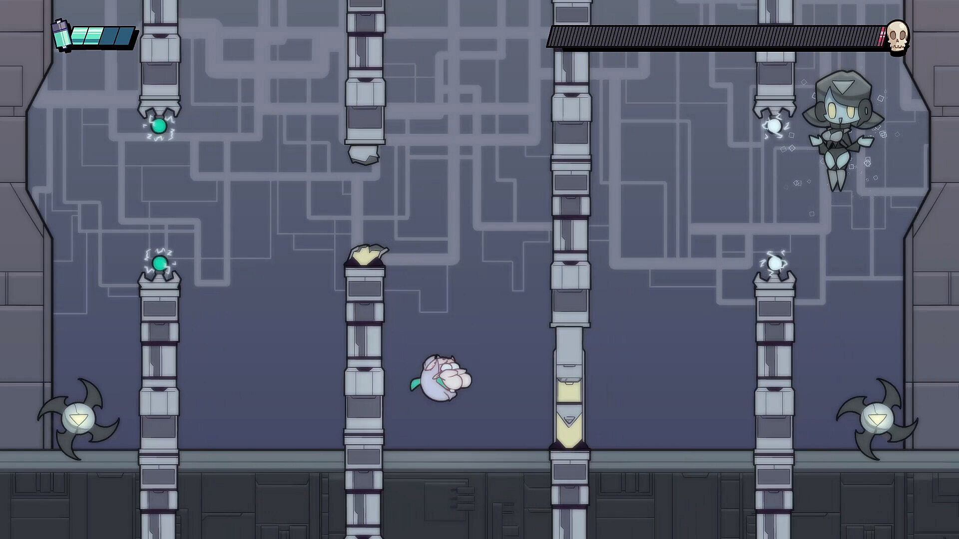 Battery System: Collect batteries to charge a defensive shield usable only in boss fights, giving you a few extra hits when you need it most.