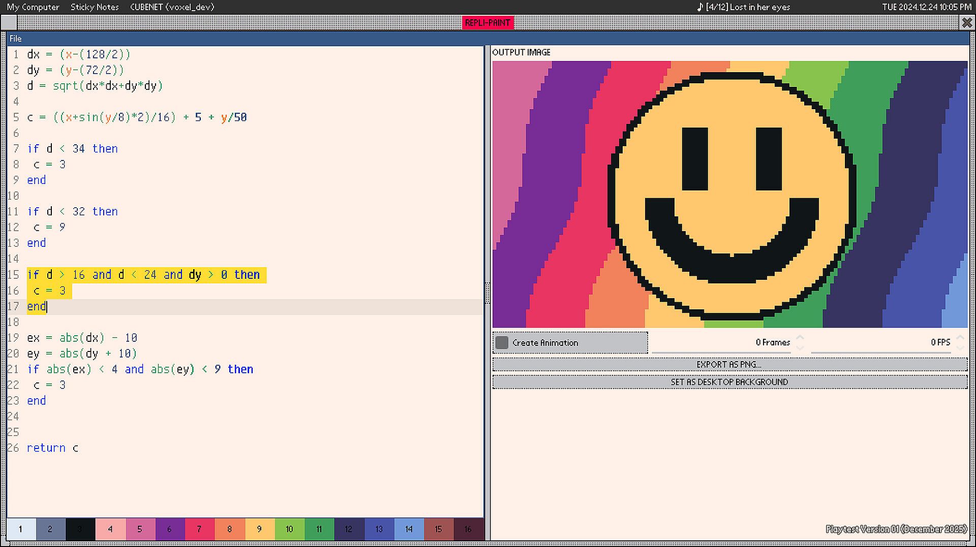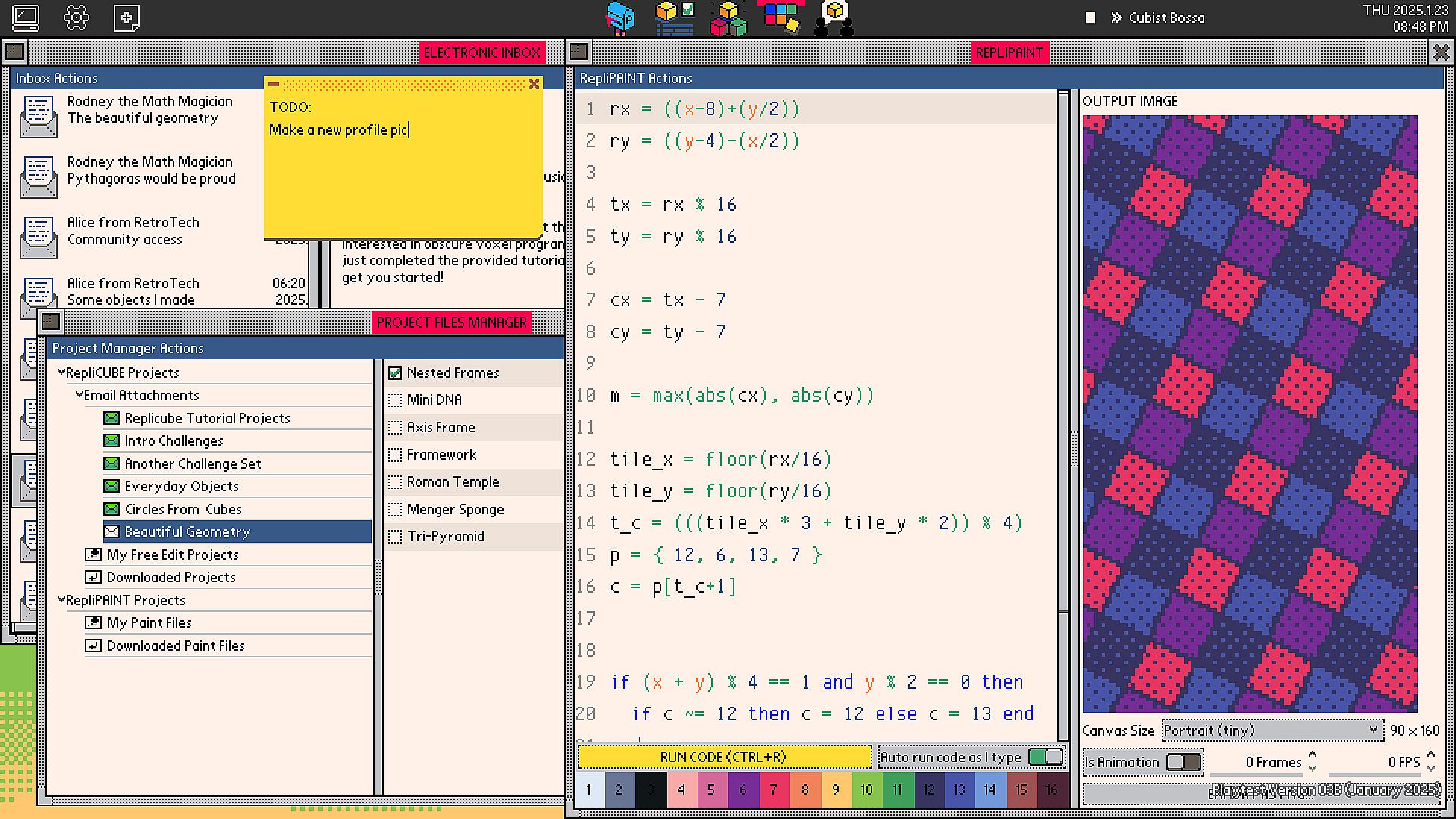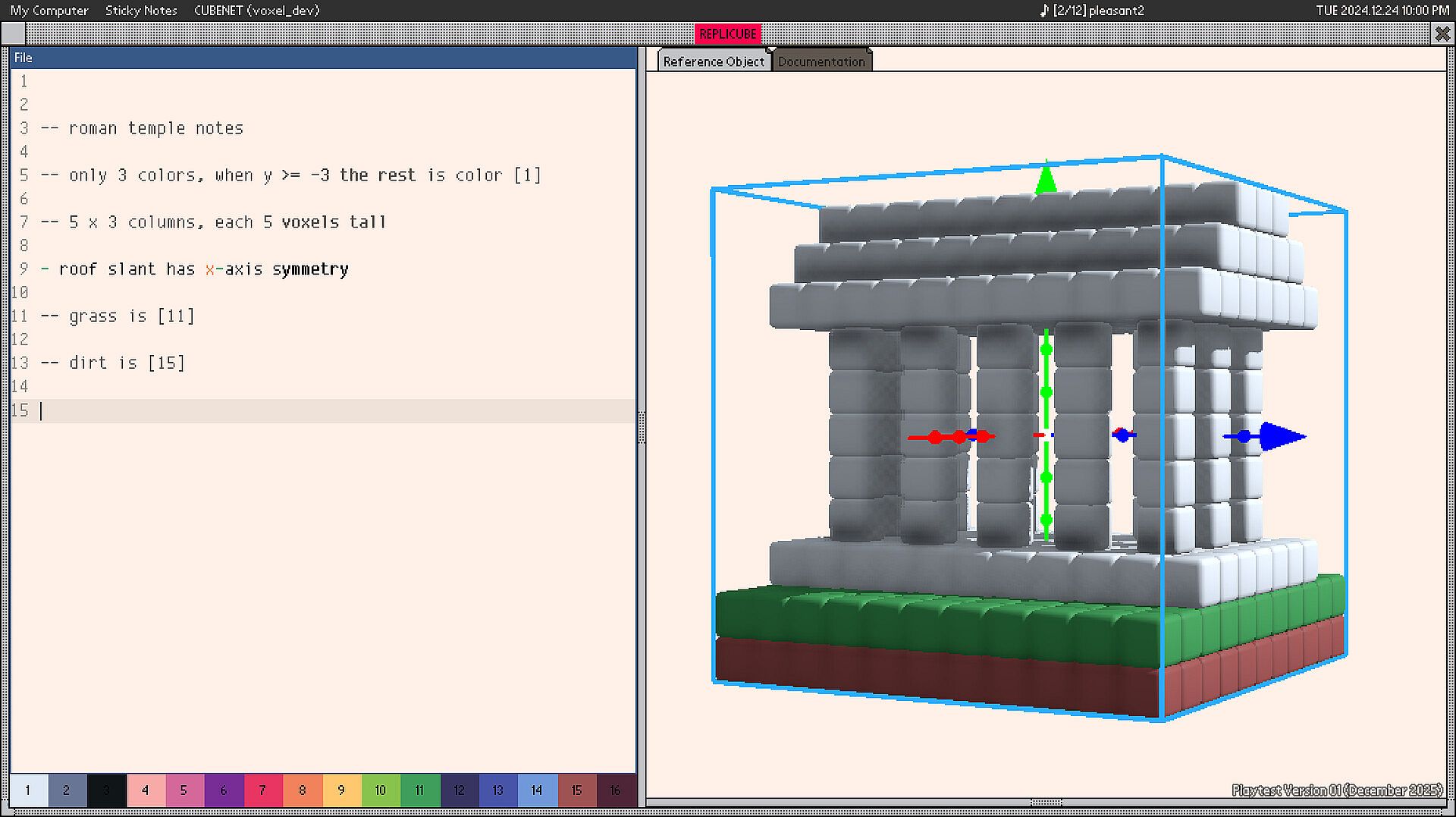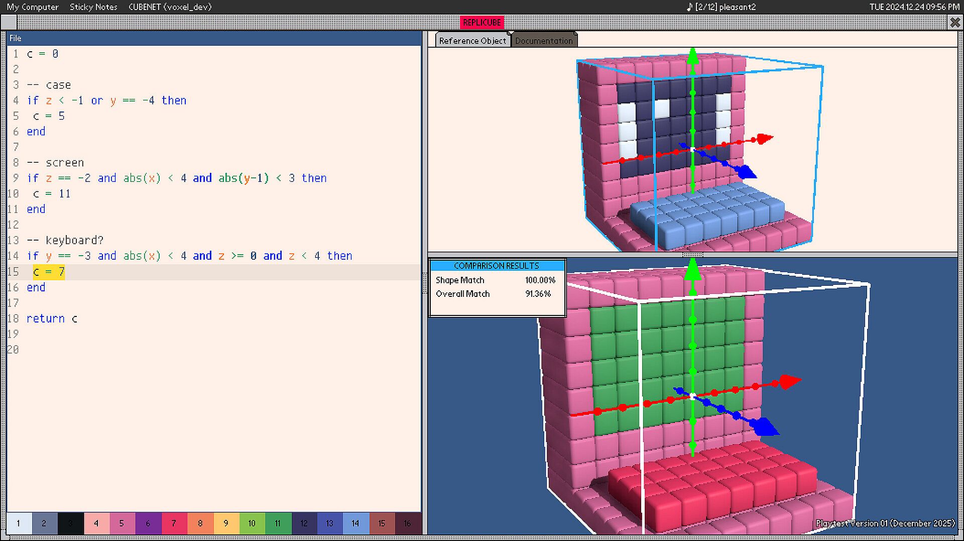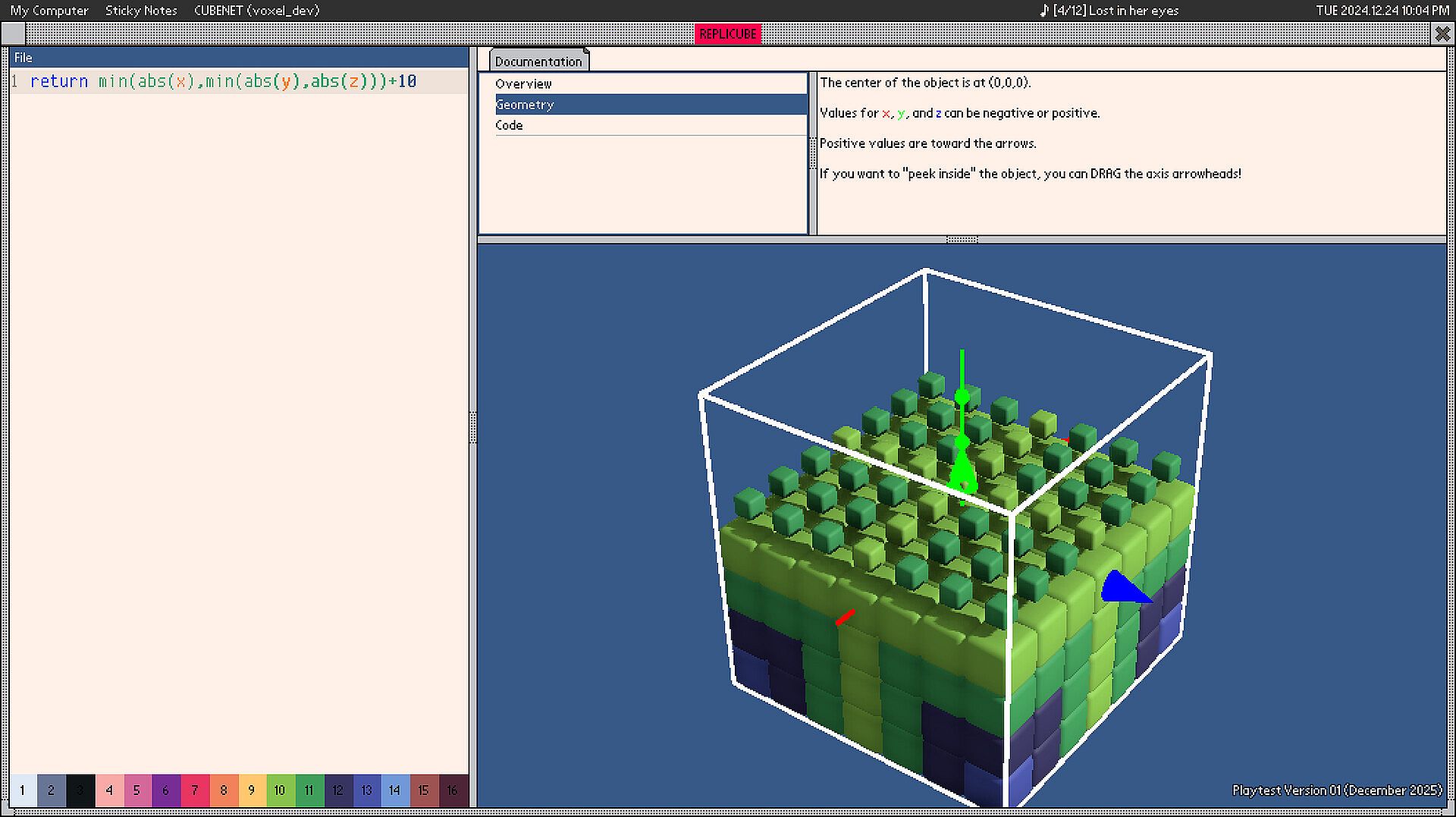 Replicube is an open-ended programming puzzle game/toy about writing code to replicate 3D voxel-based objects.