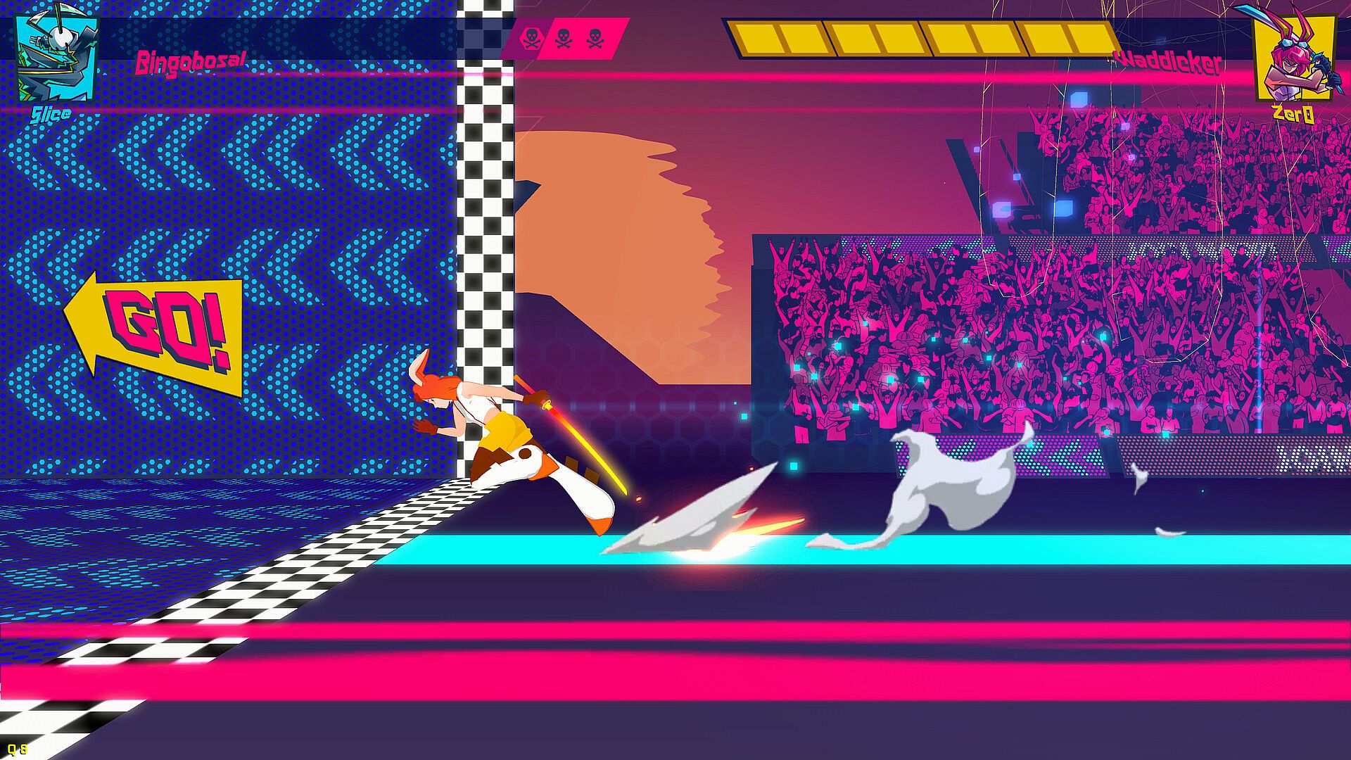 Street Fighter meets Nidhogg in the best game to introduce fighting games to your friends that don't play fighting games. Cross the goal to win the match, use the platforms to position yourself strategically, react quickly, KO your opponent, and run as fast as you can. Rollback Netcode.