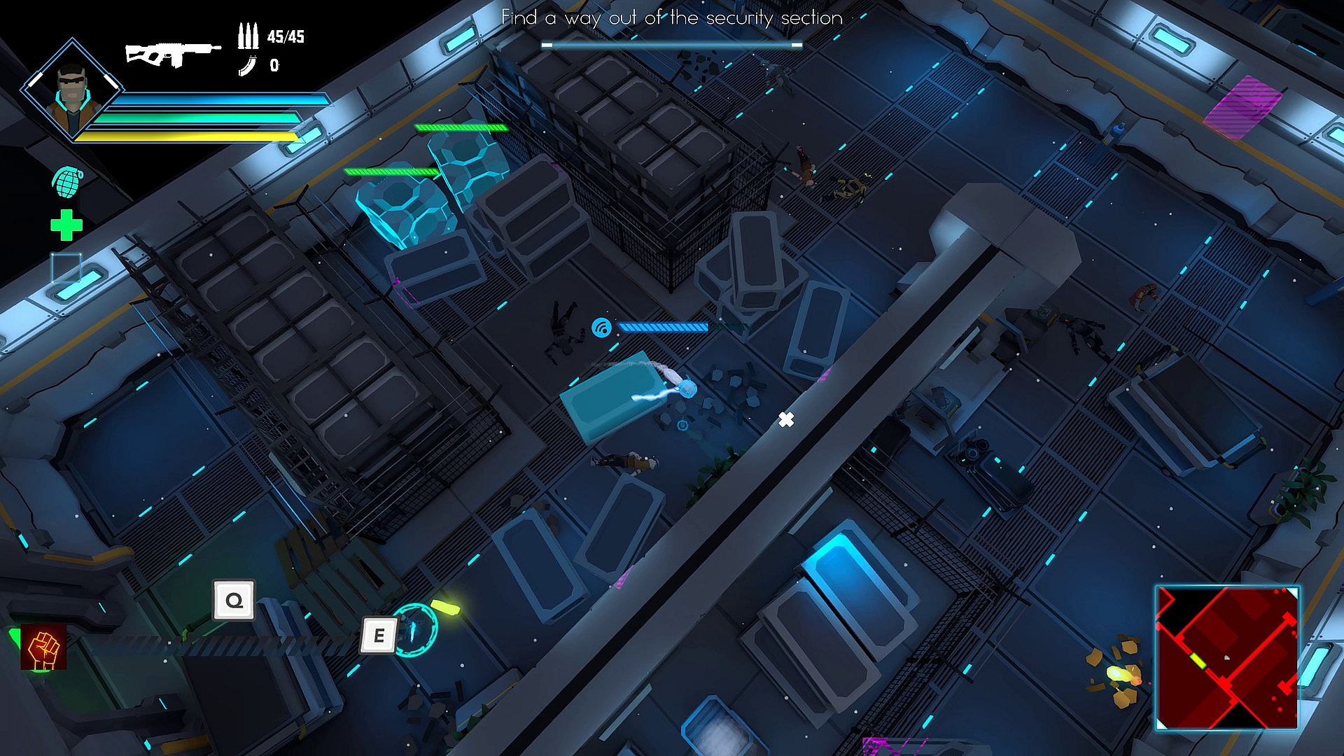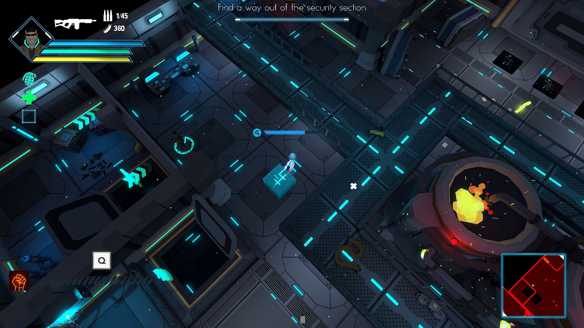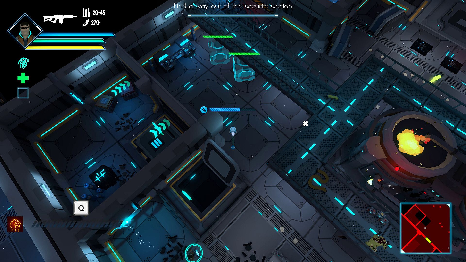 Your companion, the drone, will help you with various abilities. Manually control it to hack unreachable terminals so that no door remains locked.