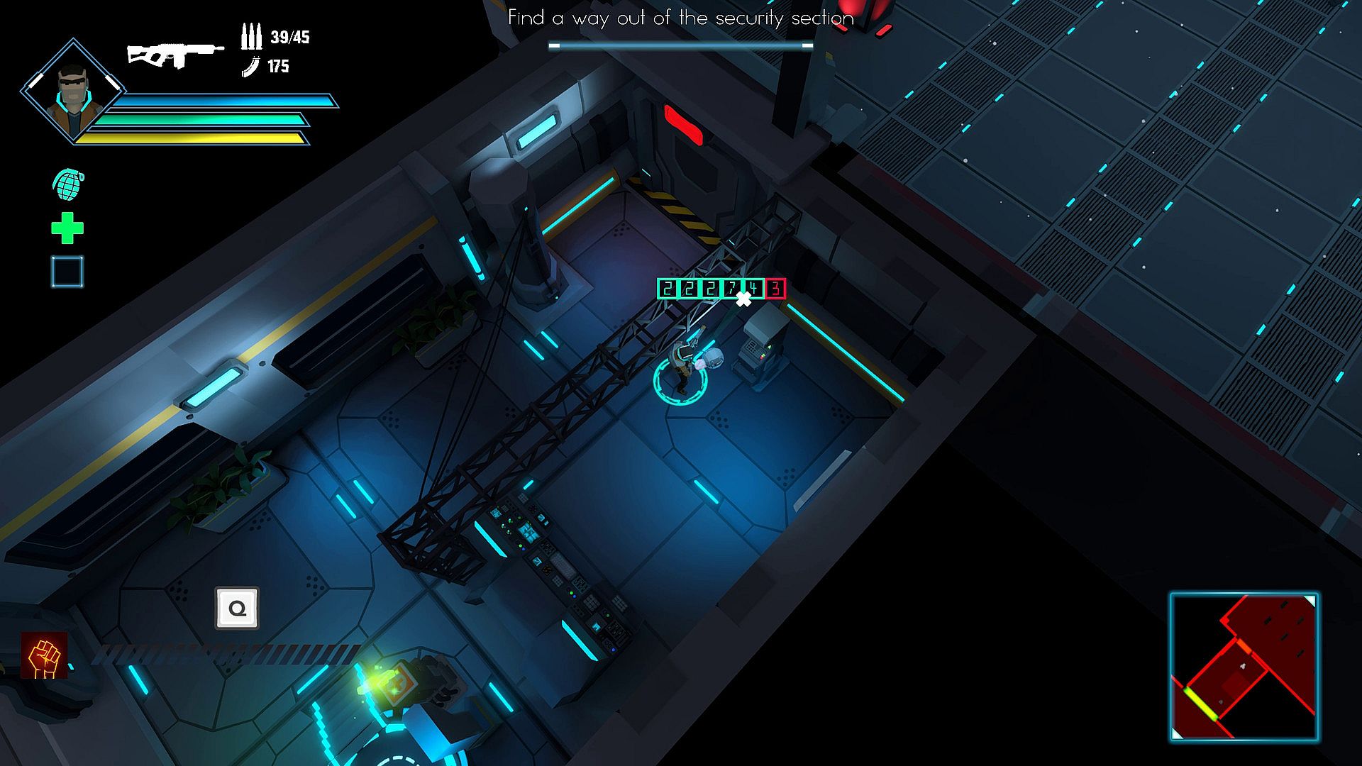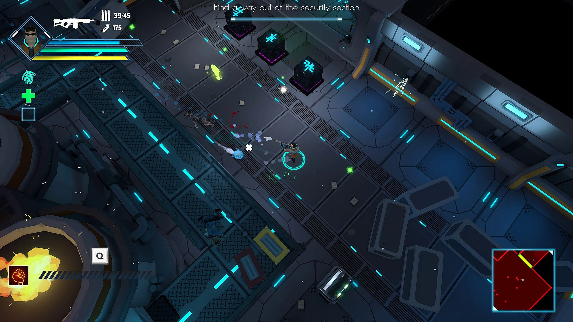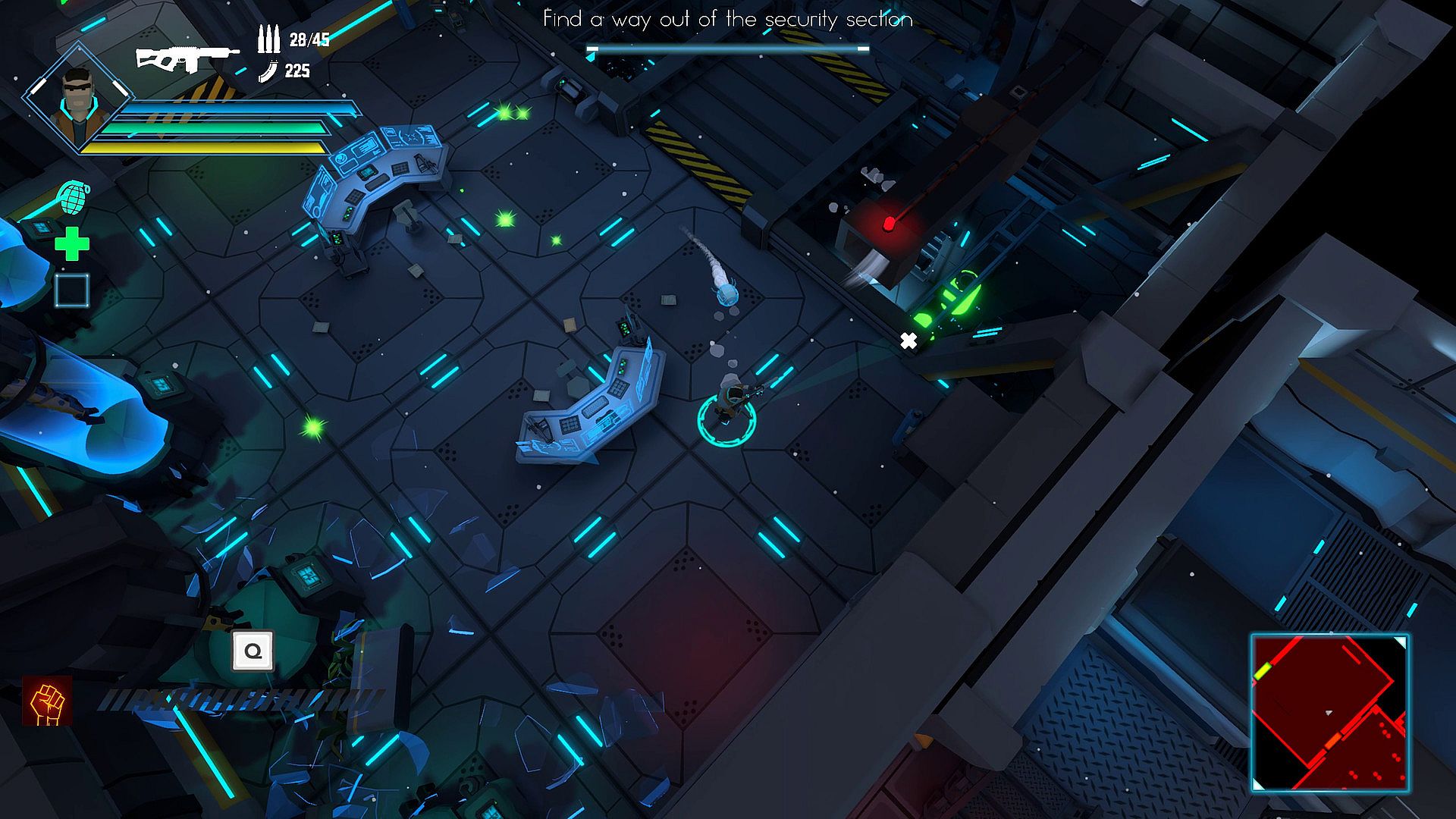 Your companion, the drone, will help you with various abilities. Manually control it to hack unreachable terminals so that no door remains locked.