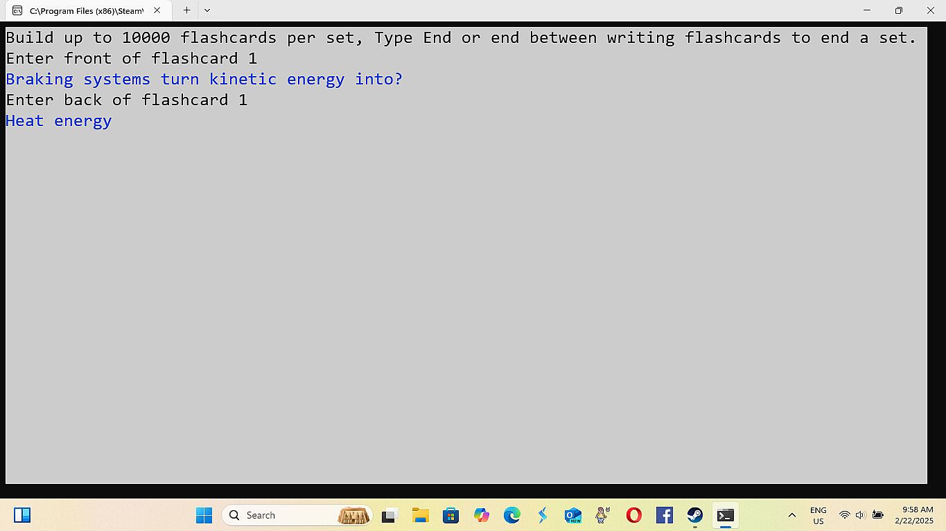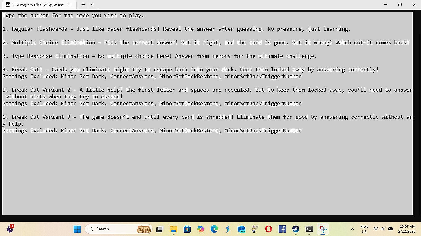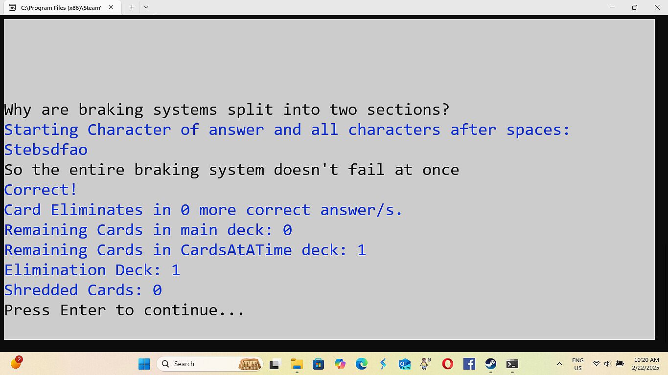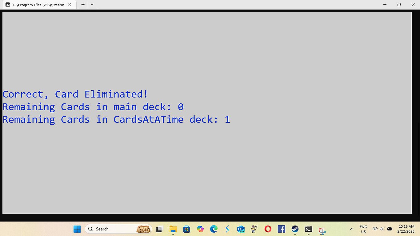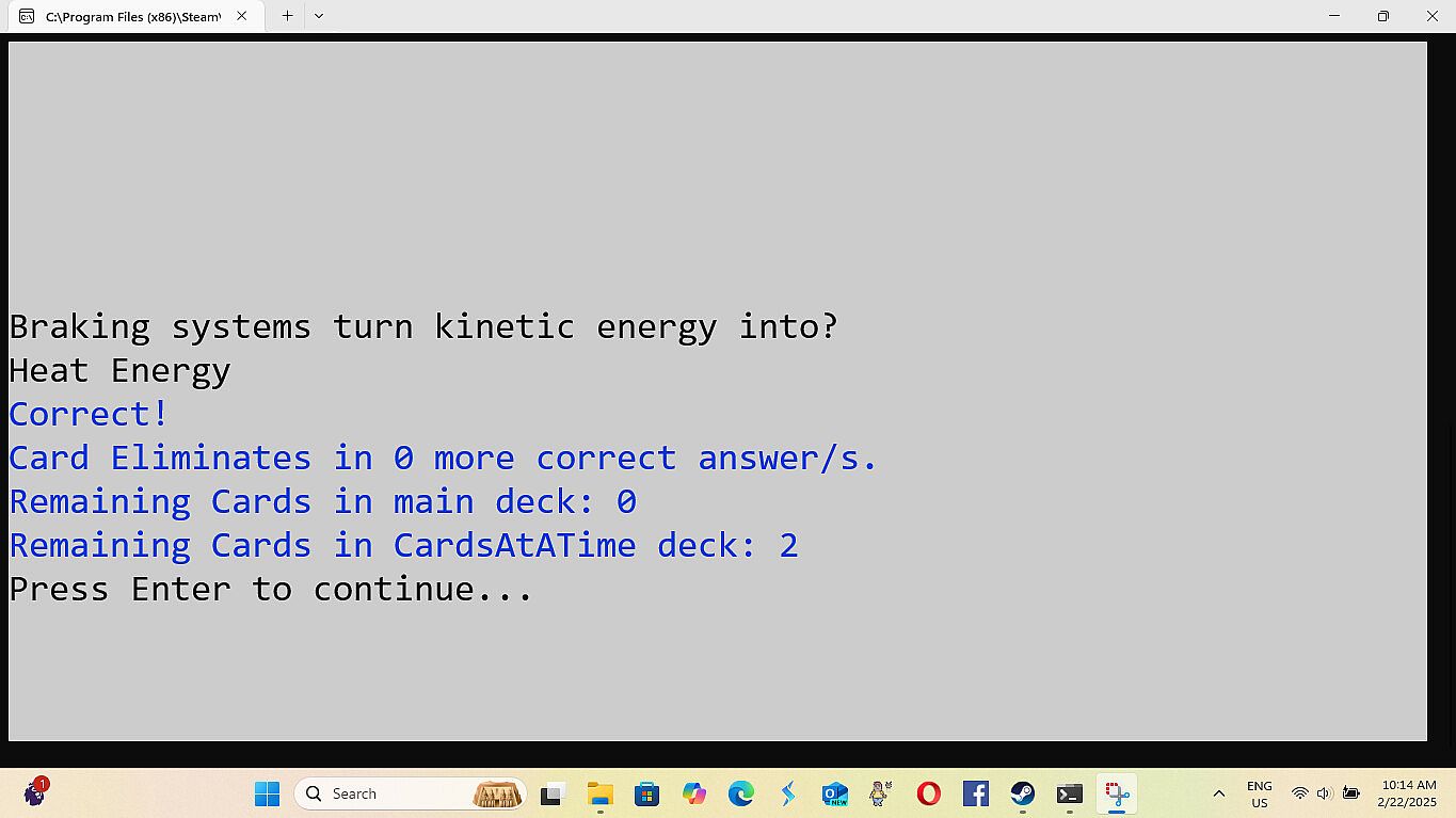 • Improvements in Navigation of the games menu - 8/28/2025 -All the improvements for this are: The game not always opening centered on the screen. (Just drag it to the center until I fix this.) When building a deck of cards the count starts at zero.(This is because it technically is card zero in the array holding the data. (Programming talk)) Having to load Cards and Settings each playthrough, even if you are using the same cards and settings again. The game minimizing and not coming back up on it's own after loading or saving a file. (The game stays at the bottom of the screen until you click on it.) Modes two and three dont have a way to exit, instead you have to either finish or close out. Mode one has exit by simply typing exit. (I couldn't do that for mode two and three because if you have a card where the answer is exit then exit is multiple things.)