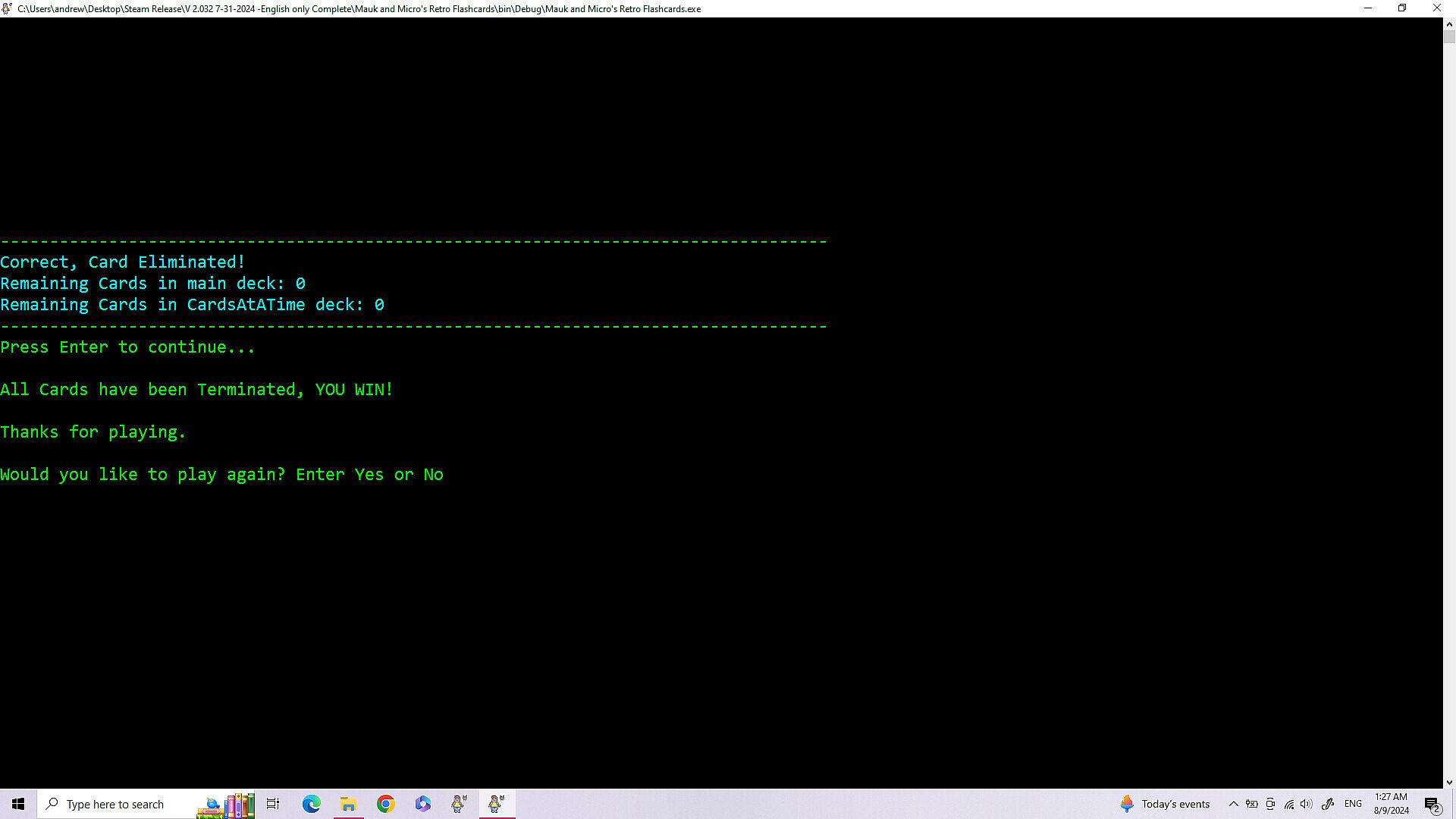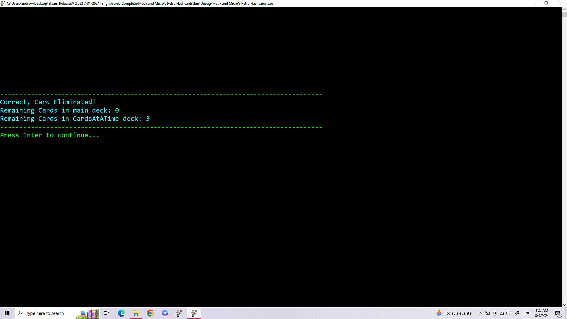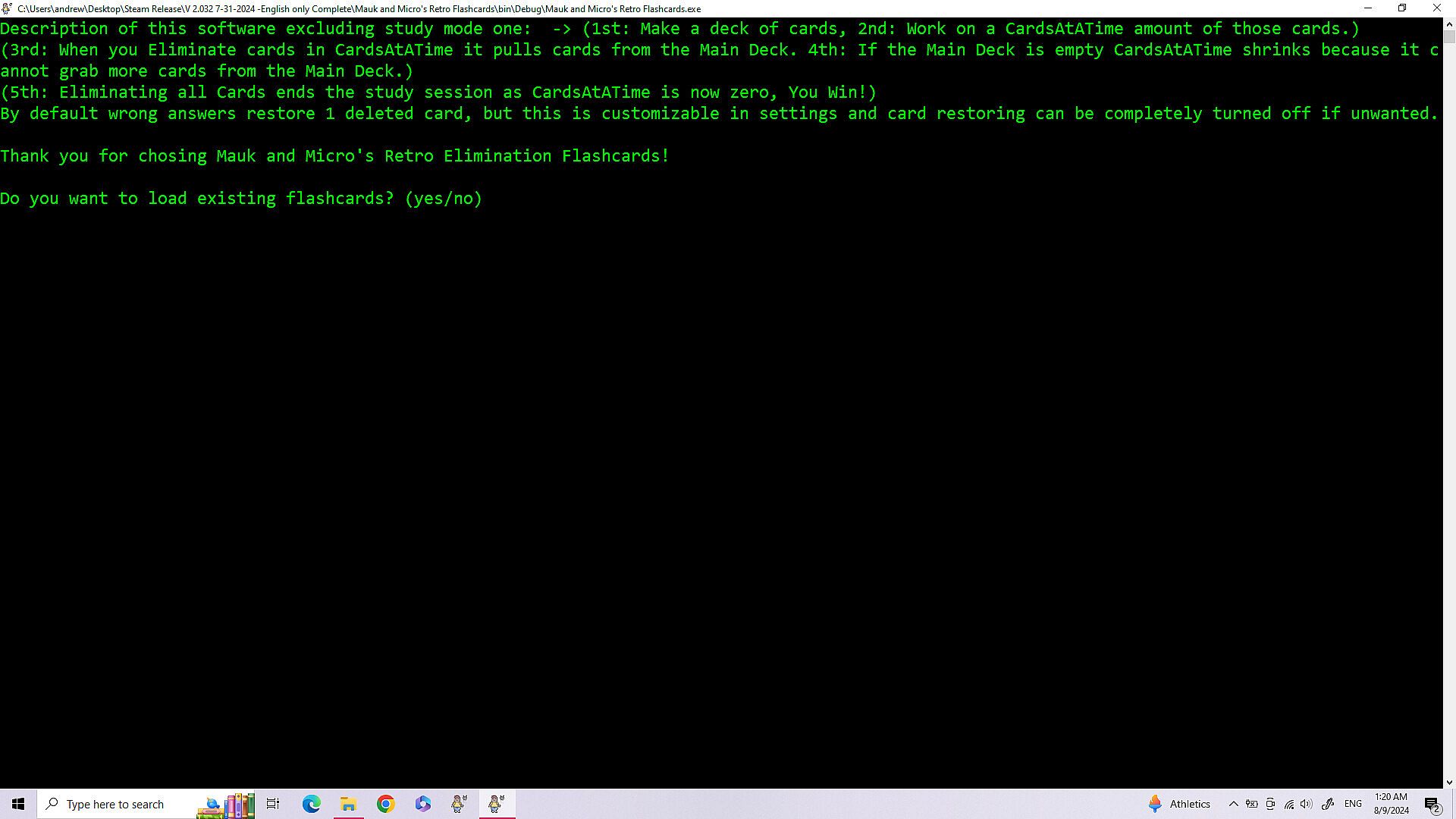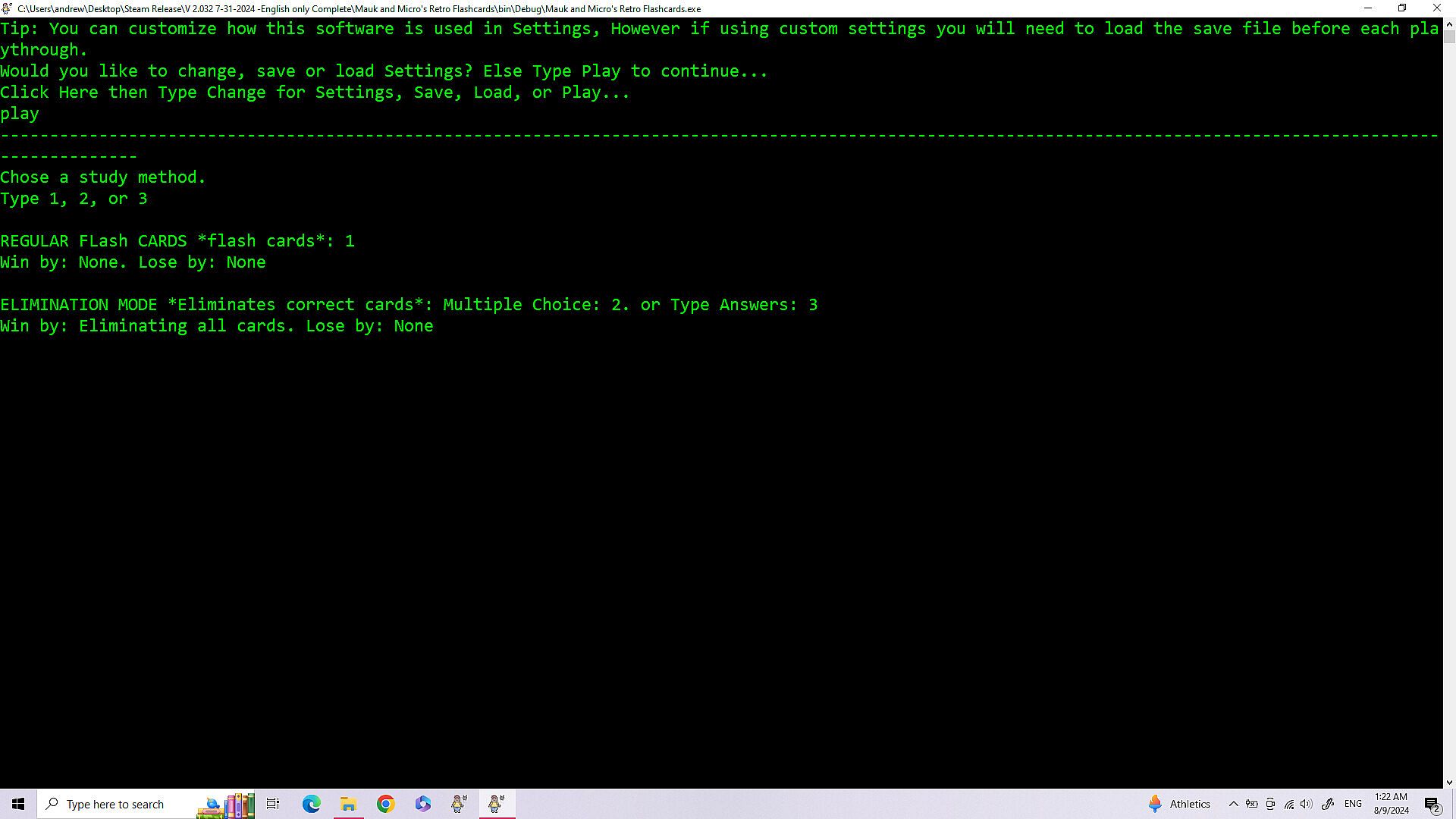 • Improvements in Navigation of the games menu - 8/28/2025 -All the improvements for this are: The game not always opening centered on the screen. (Just drag it to the center until I fix this.) When building a deck of cards the count starts at zero.(This is because it technically is card zero in the array holding the data. (Programming talk)) Having to load Cards and Settings each playthrough, even if you are using the same cards and settings again. The game minimizing and not coming back up on it's own after loading or saving a file. (The game stays at the bottom of the screen until you click on it.) Modes two and three dont have a way to exit, instead you have to either finish or close out. Mode one has exit by simply typing exit. (I couldn't do that for mode two and three because if you have a card where the answer is exit then exit is multiple things.)