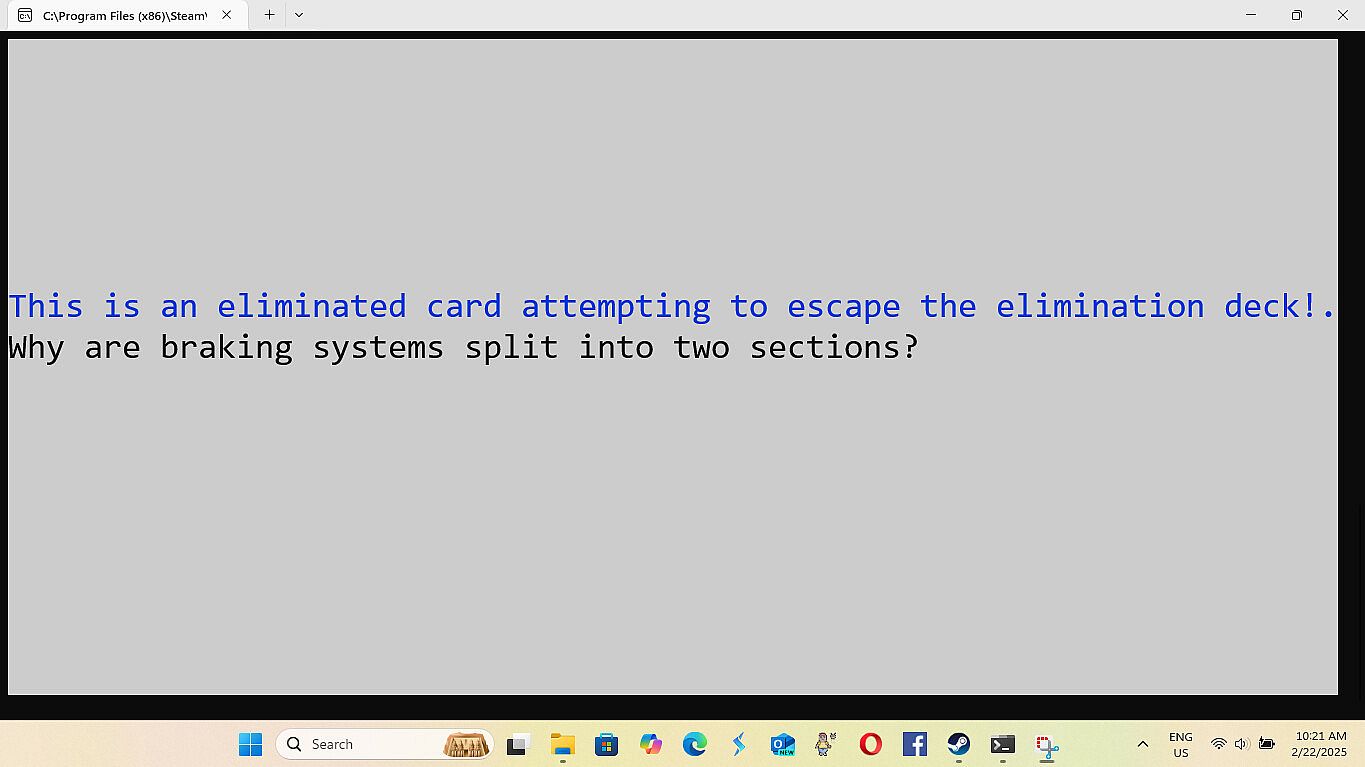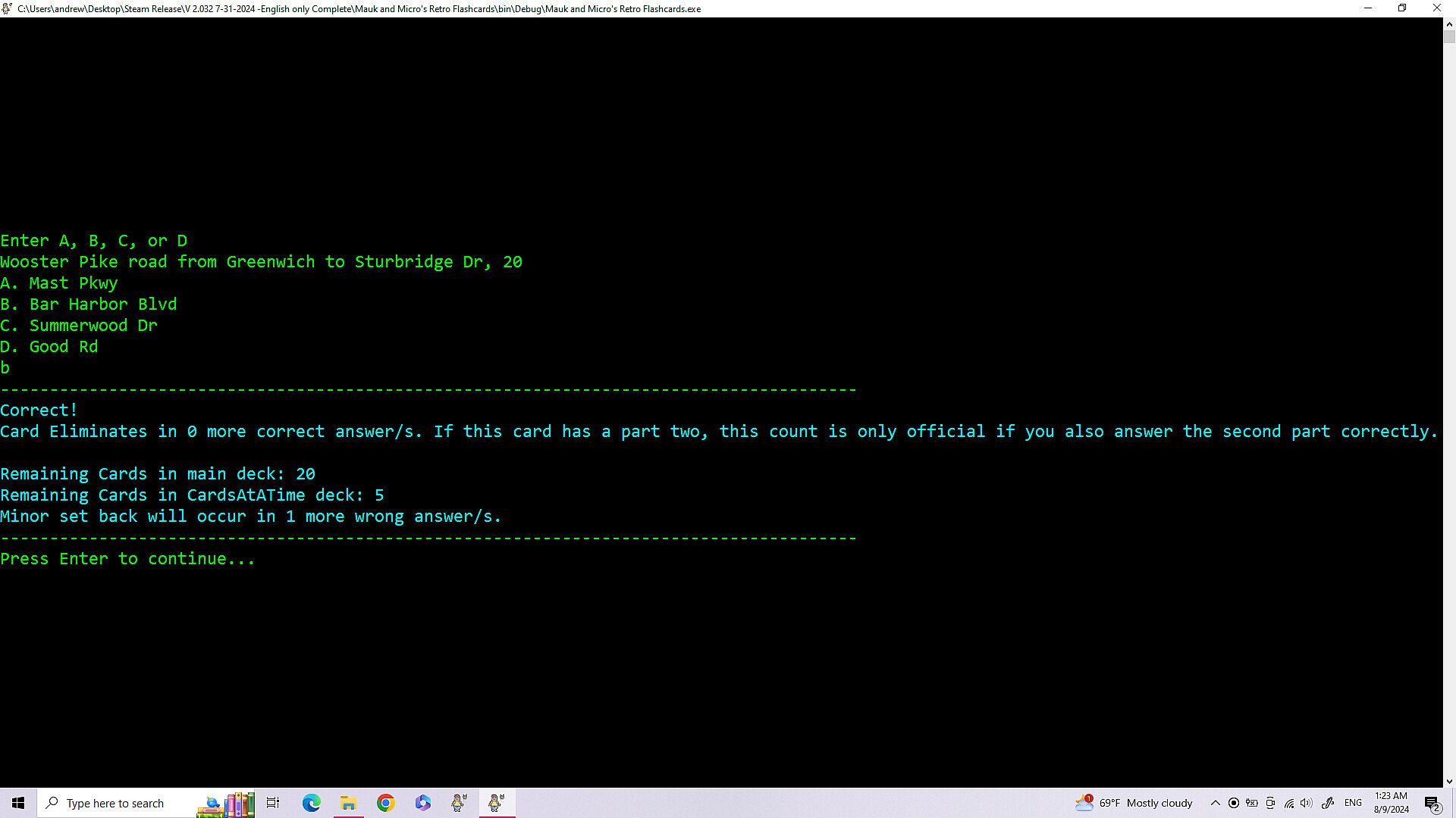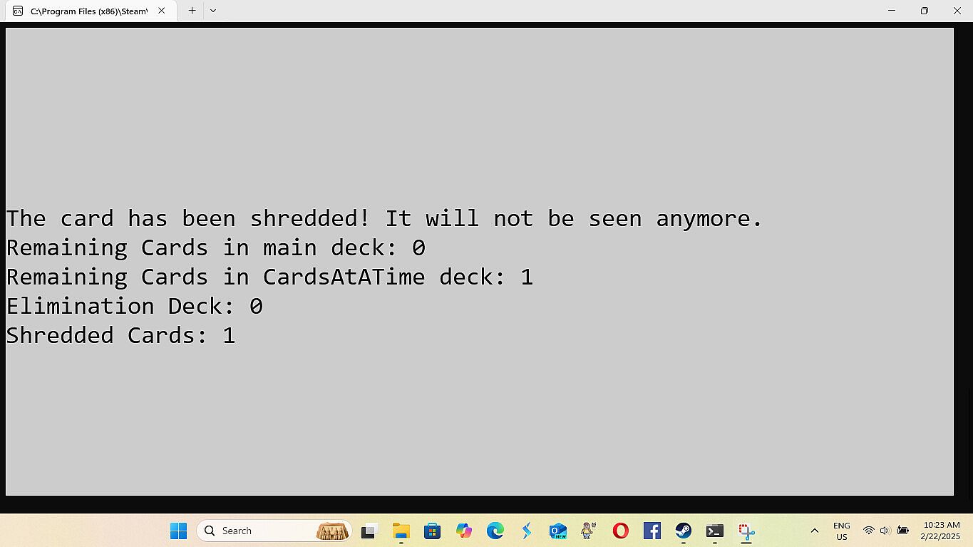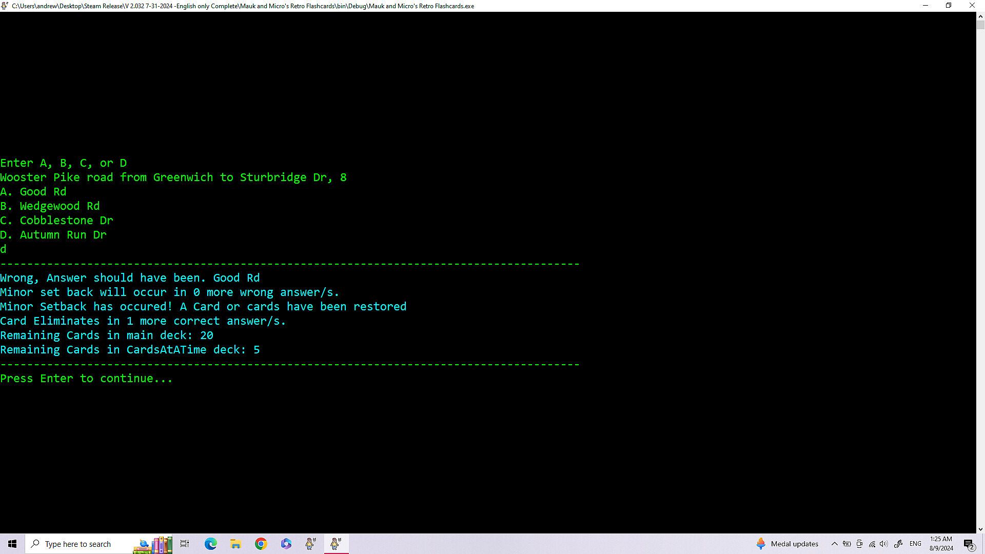 • Improvements in Navigation of the games menu - 8/28/2025 -All the improvements for this are: The game not always opening centered on the screen. (Just drag it to the center until I fix this.) When building a deck of cards the count starts at zero.(This is because it technically is card zero in the array holding the data. (Programming talk)) Having to load Cards and Settings each playthrough, even if you are using the same cards and settings again. The game minimizing and not coming back up on it's own after loading or saving a file. (The game stays at the bottom of the screen until you click on it.) Modes two and three dont have a way to exit, instead you have to either finish or close out. Mode one has exit by simply typing exit. (I couldn't do that for mode two and three because if you have a card where the answer is exit then exit is multiple things.)