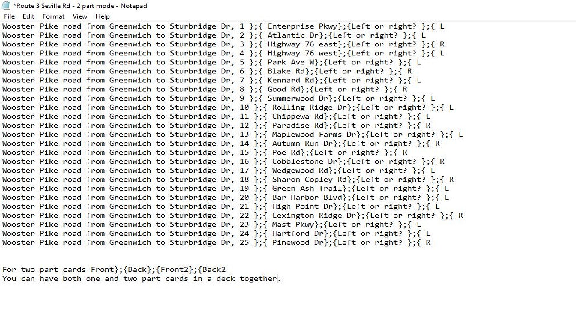 The display side of the cards can be changed to back side. Cards can have a follow up question (Two part cards). Two part cards are only counted as correct if both parts are answered correctly. This software is customizable but by default correct answers delete the card and wrong answers restore a random card unless all cards are already in play. Card restoring can be turned off if unwanted by changing Minor Set Back to Off.