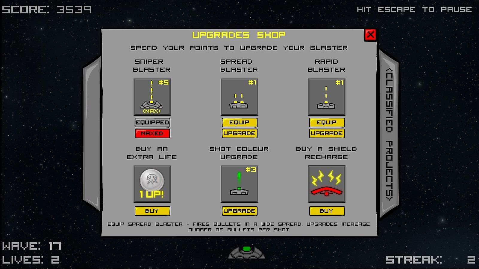 • 3 Playable Blasters - Swap between the Sniper, Spread and Rapid blasters as you destroy the Vaders, each one redesigned with new visual changes as you upgrade and rebalanced stats compared to the original game.