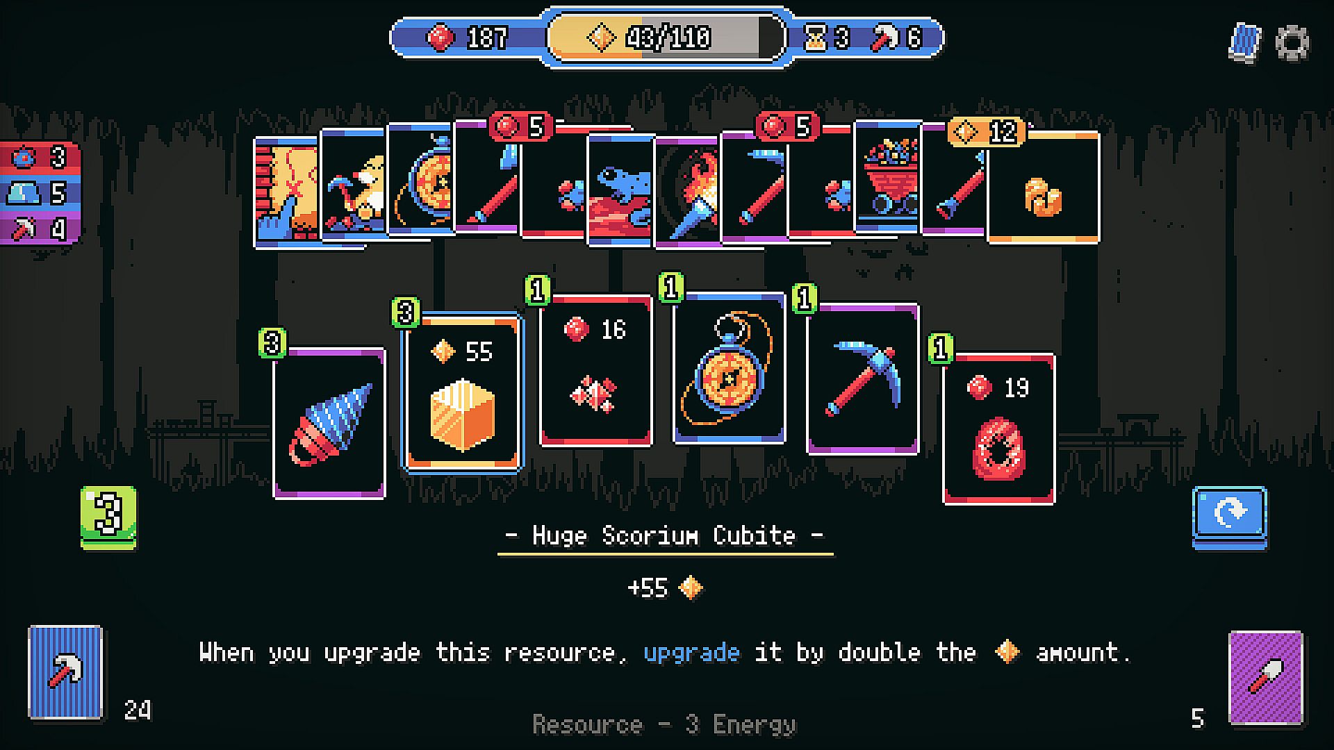 Strike a perfect balance: Survive by mining scorium to narrowly escape danger, get stronger by mining ore to buy new cards
