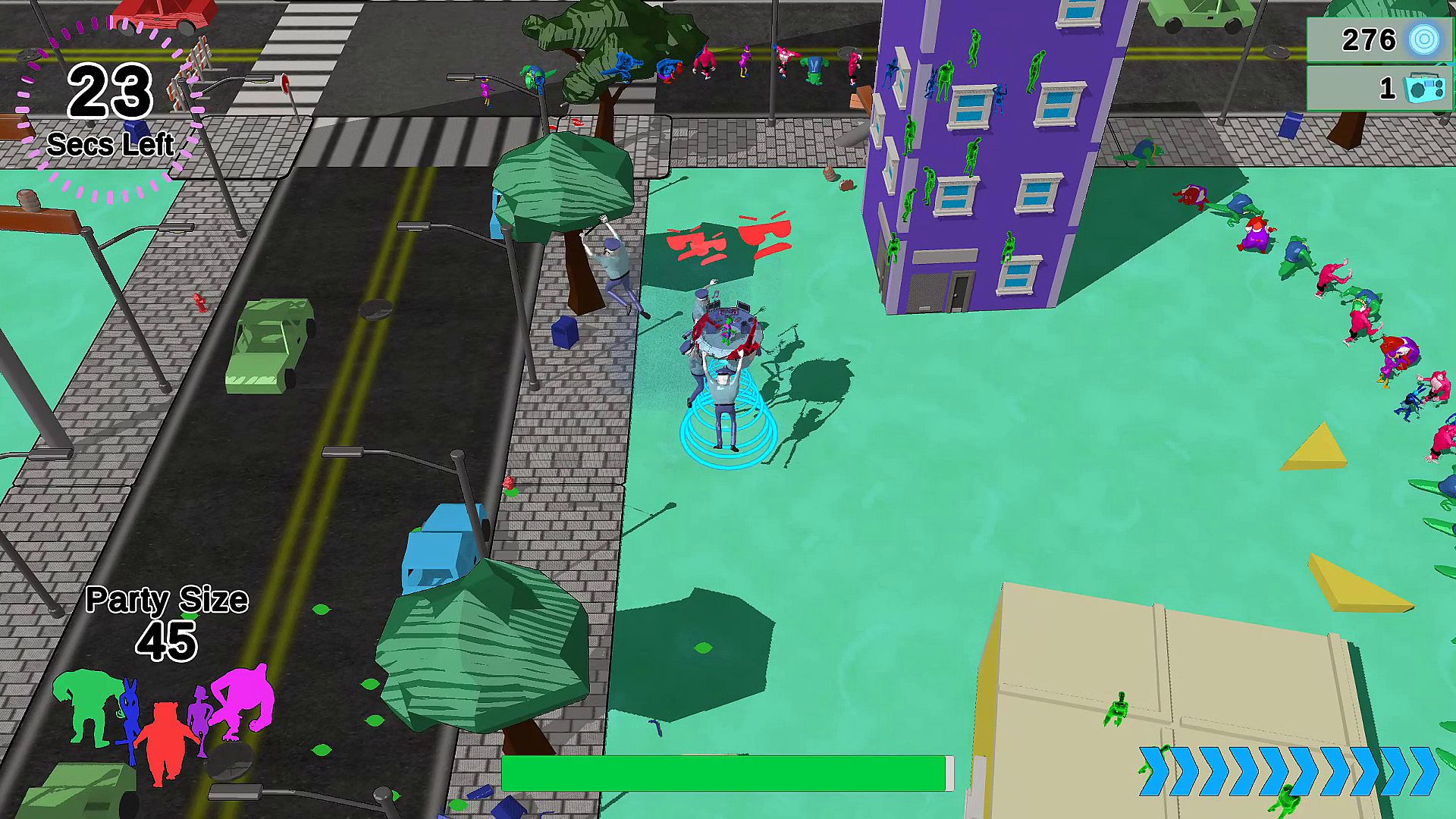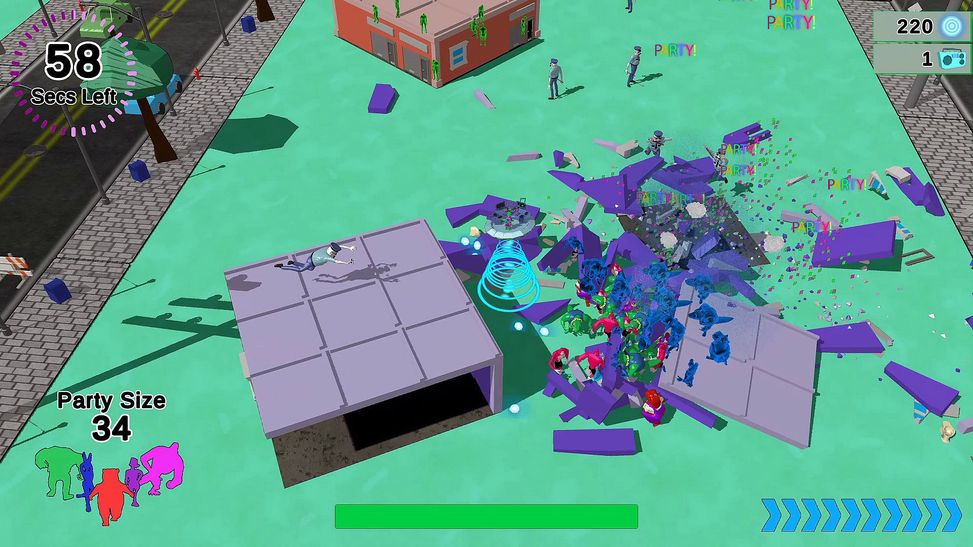 As an alien DJ in service to your party god you are tasked with running amok in a boring world to get as many party animals and to clear enough space to throw a rave epic enough in time. You'll fly your UFO DJ booth leading your party mob through a fully destructible, physics based city to find as many boring people to join you as you can before time runs out and you get a visit from the party god who will be expecting an epic party! Topple buildings, convert the boring people and throw a massive rave!