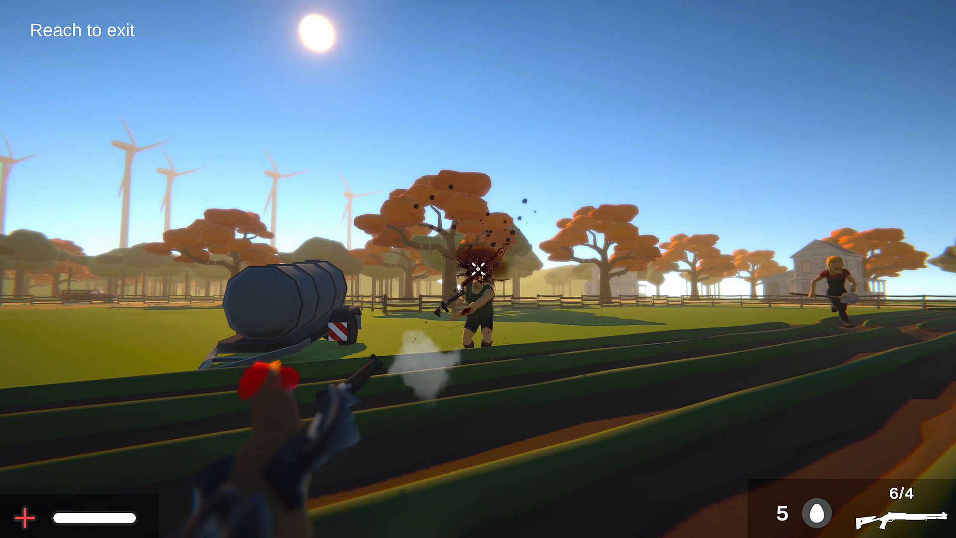 You can use different type of weapons. Axe, knife, shotgun, pistol, or rifles. You can aim for limbs and try to dismember your enemies. You can also throw explosive eggs to explode your enemies.