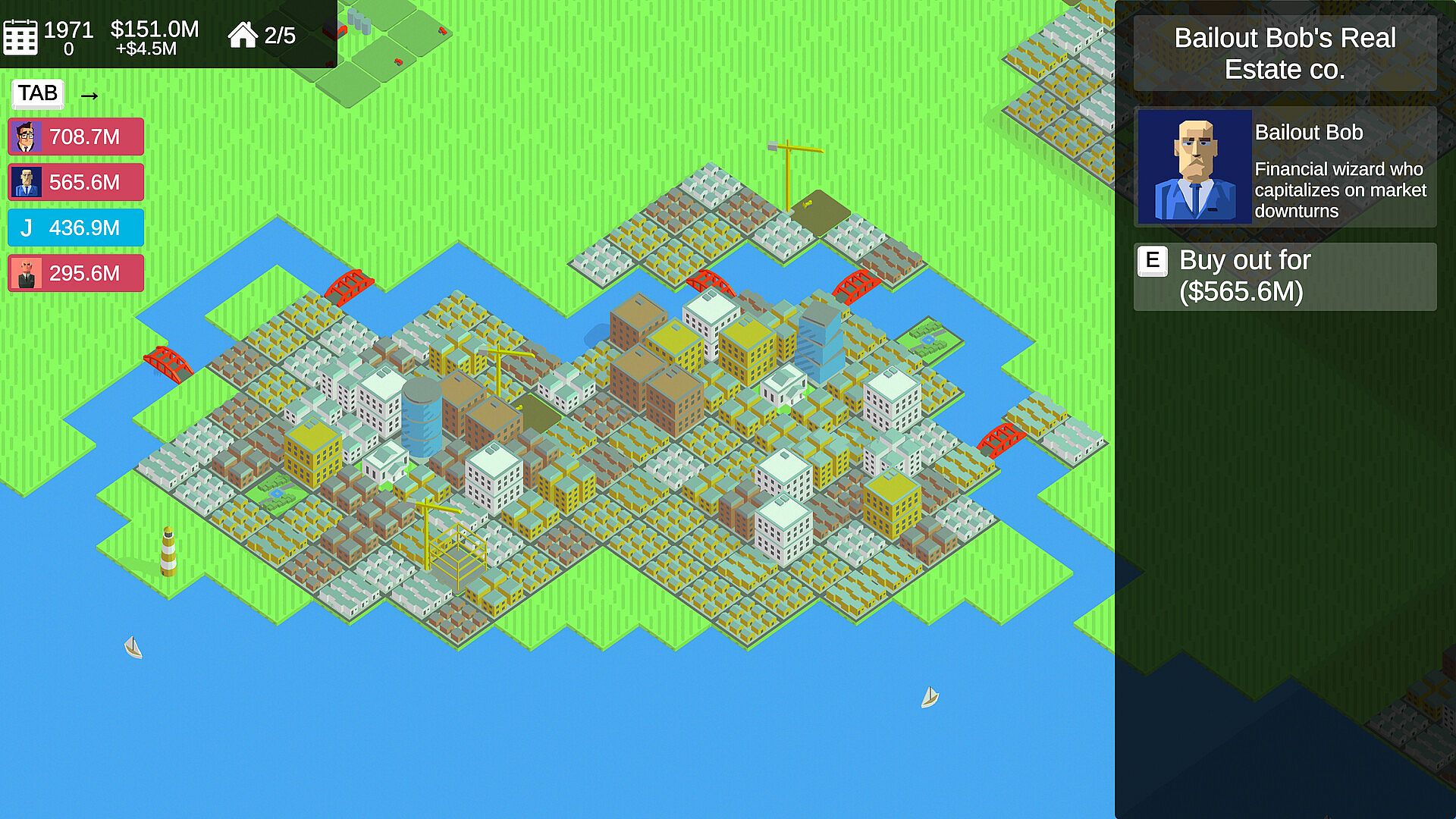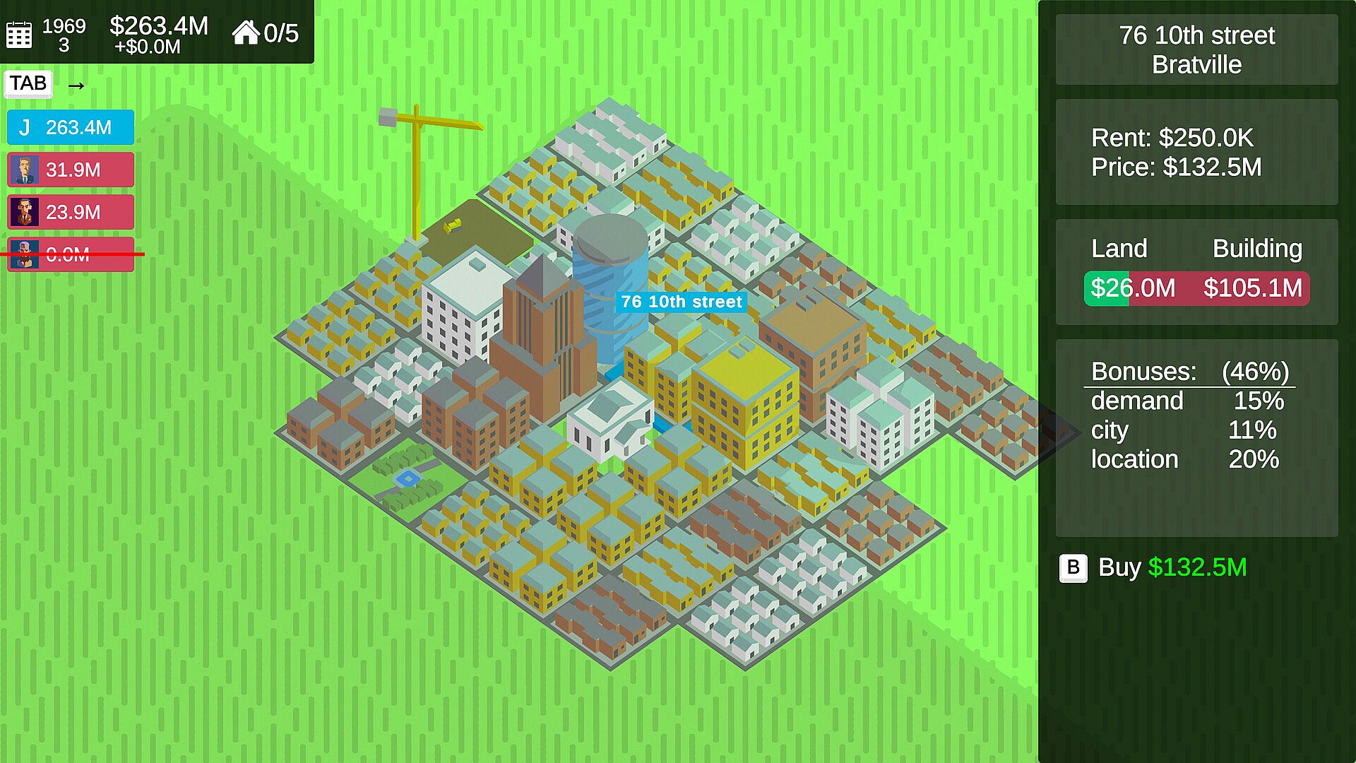 Embark on a journey as a real estate developer in a dynamic world with competitors! Generate income by flipping houses, constructing new homes, and managing rentals. Navigate market changes with strategic buying and selling. Accumulate wealth and buy out your competitors to win!