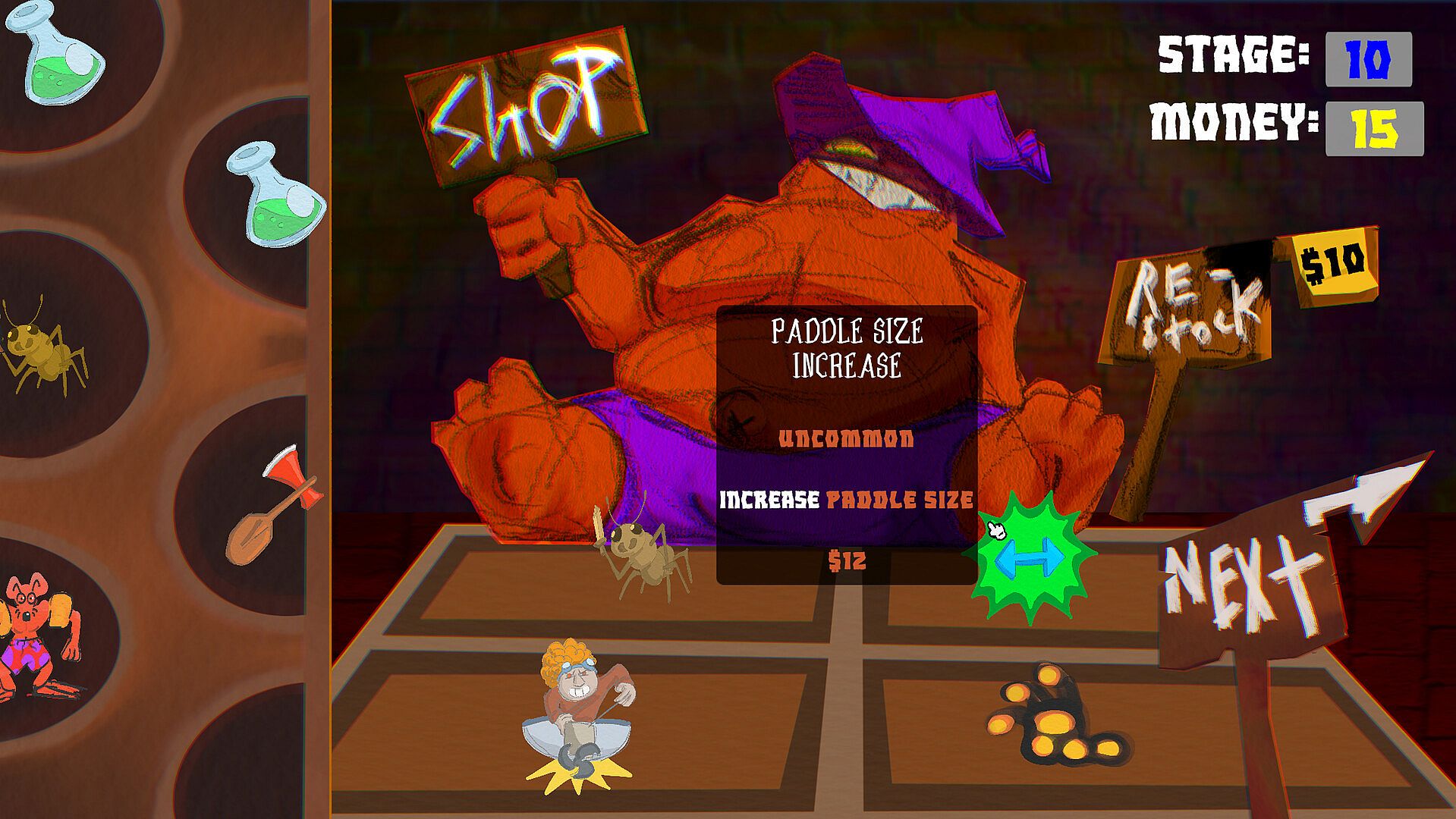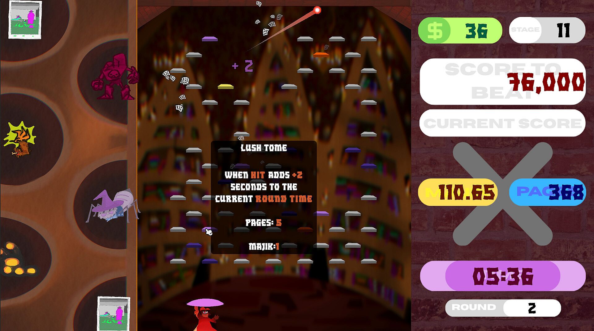 Each stage challenges you to surpass a target score by launching your projectile into a library of magical tomes, each with unique effects that can combine and interact with the modifiers you’ve purchased in the shop.