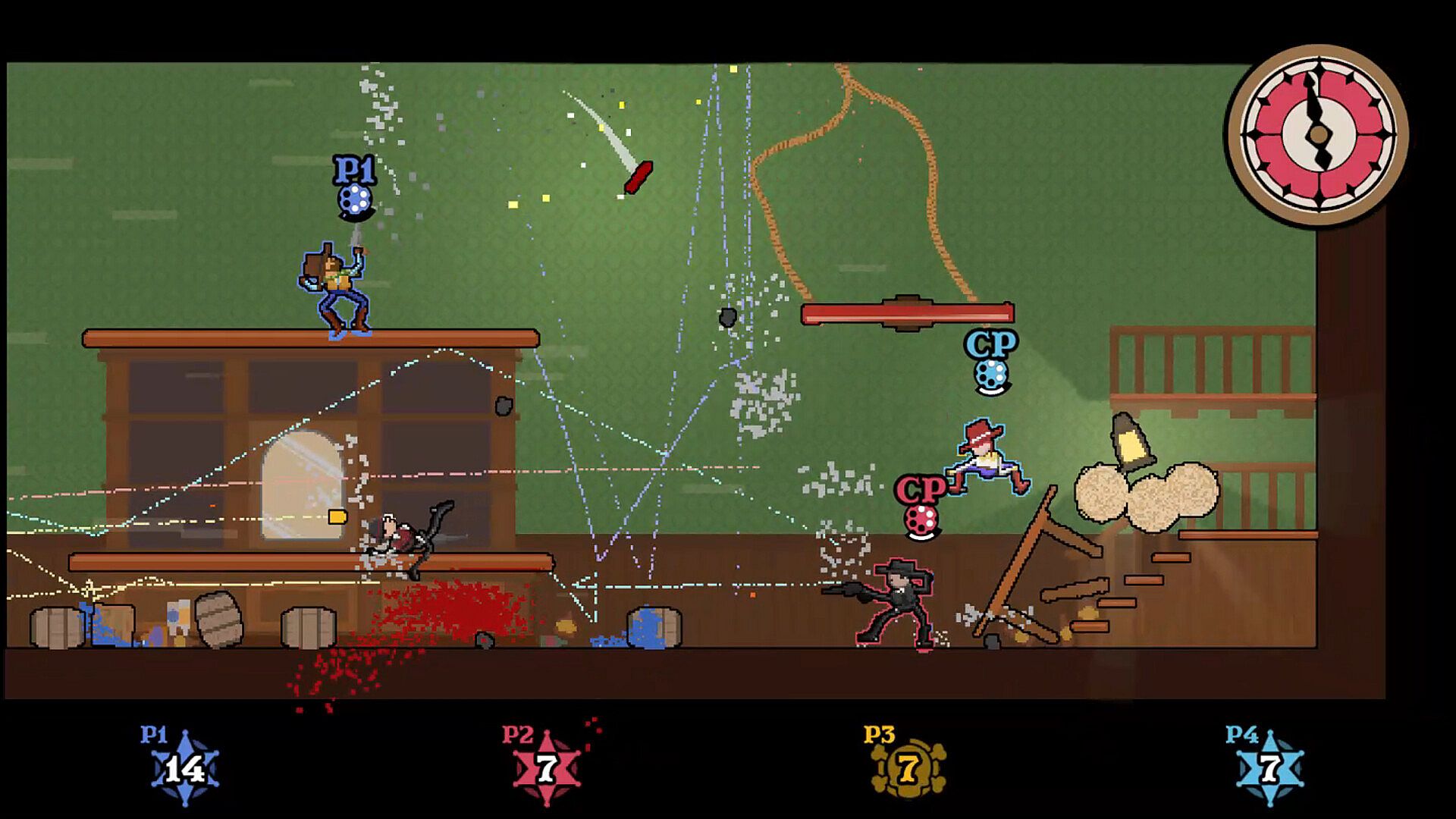 Fast-paced multiplayer action explodes in Ricochet Rodeo, where every bullet bounces off surfaces in physics-driven chaos. Players chase kills in free-for-all deathmatches lasting three minutes, dodging ricochets that deliver one-hit kills. Tools like knives handle close-quarters combat during reloads, while sharp reflexes let you deflect incoming fire or shoot dynamite mid-air. Pixel-rendered spaghetti western arenas fill with bullet trails, debris, and flip-up tables for cover. Couch co-op or online matches on PC bring up to eight players into the fray. Competitive players master angles to land precise ricochets and outlast rivals in this indie brawler.