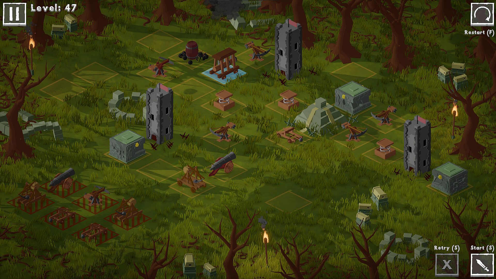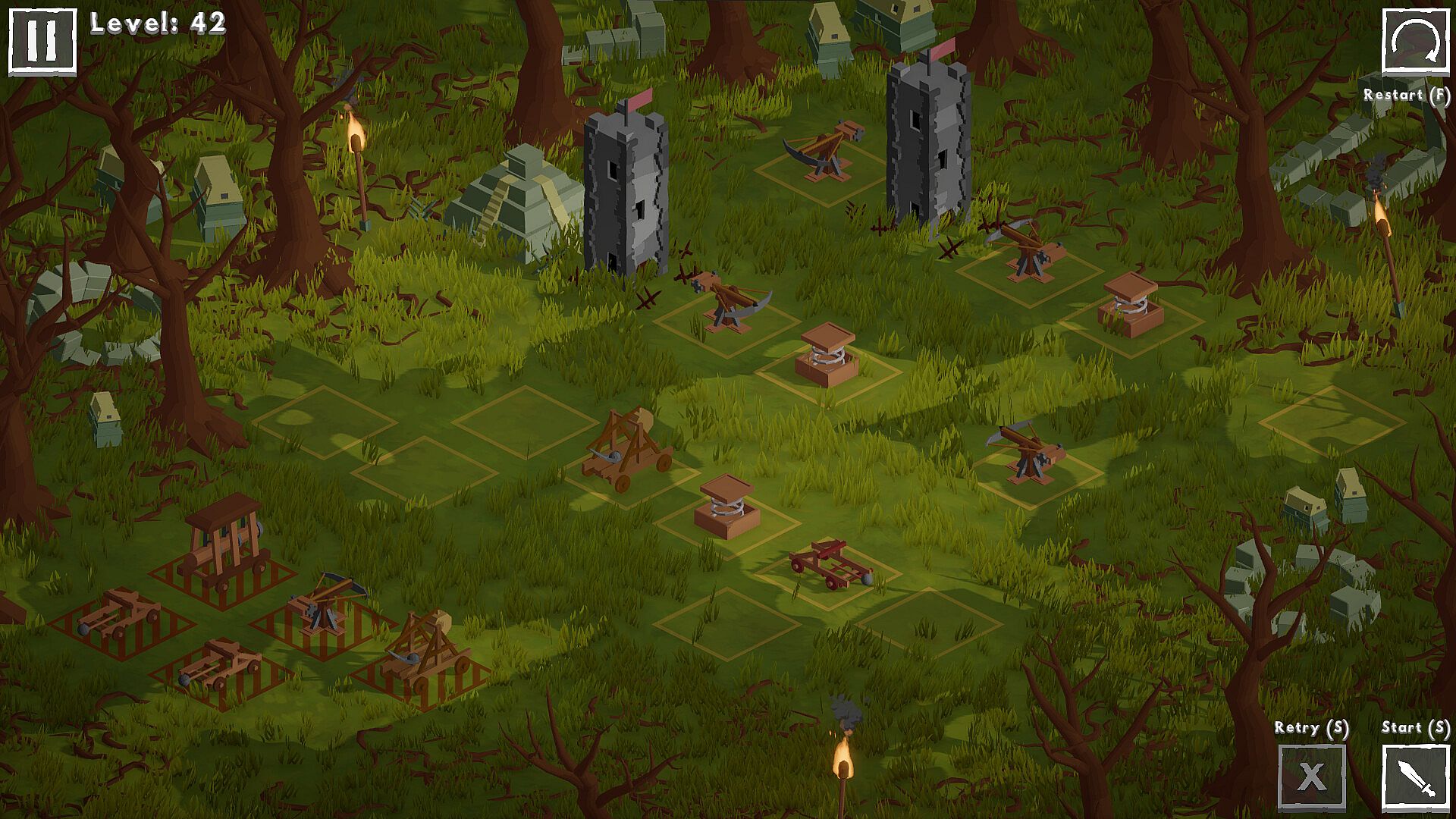 Riddles & Sieges is a medieval puzzle game where you use old siege weapons to solve puzzles.Each building works and attacks differently. For example catapult shoots over a tile. Trebuchet does the same, but has a delay before attacking. And ballista only attacks when being destroyed.
