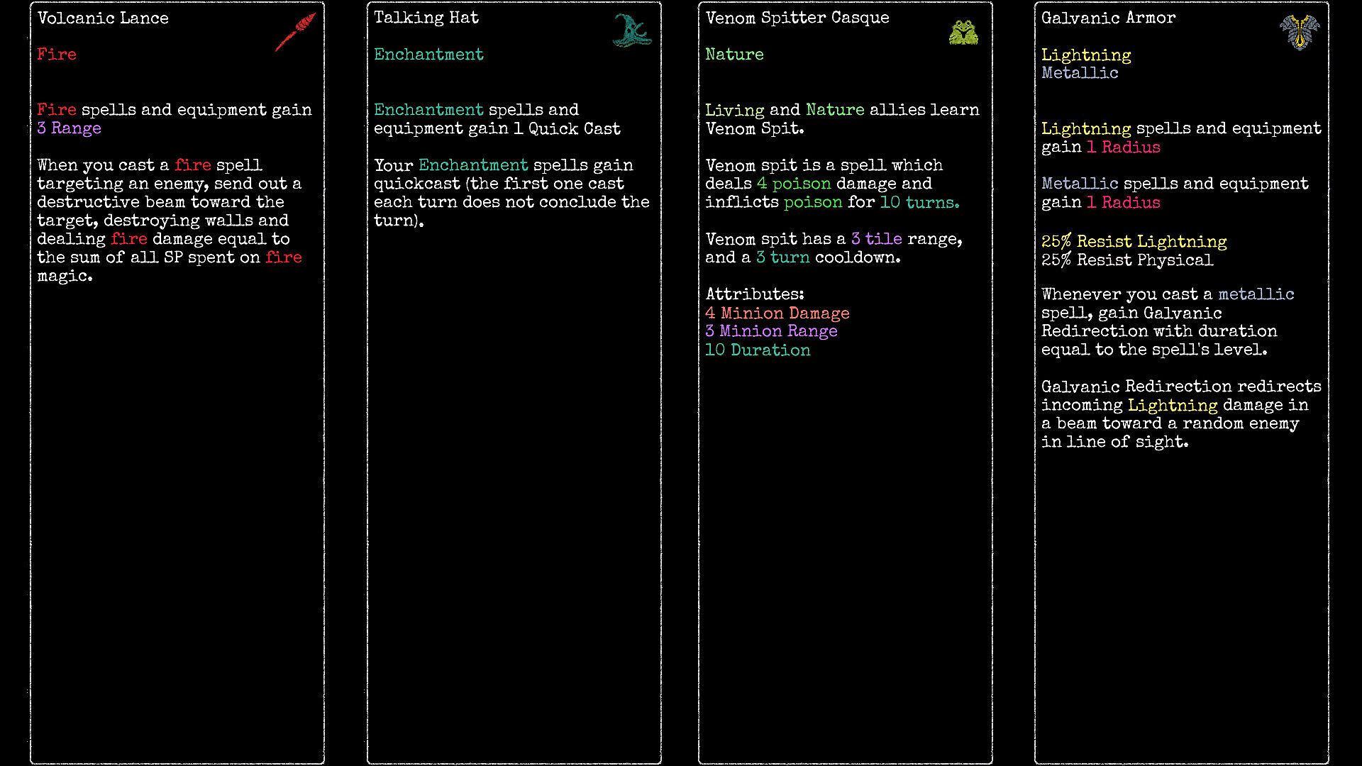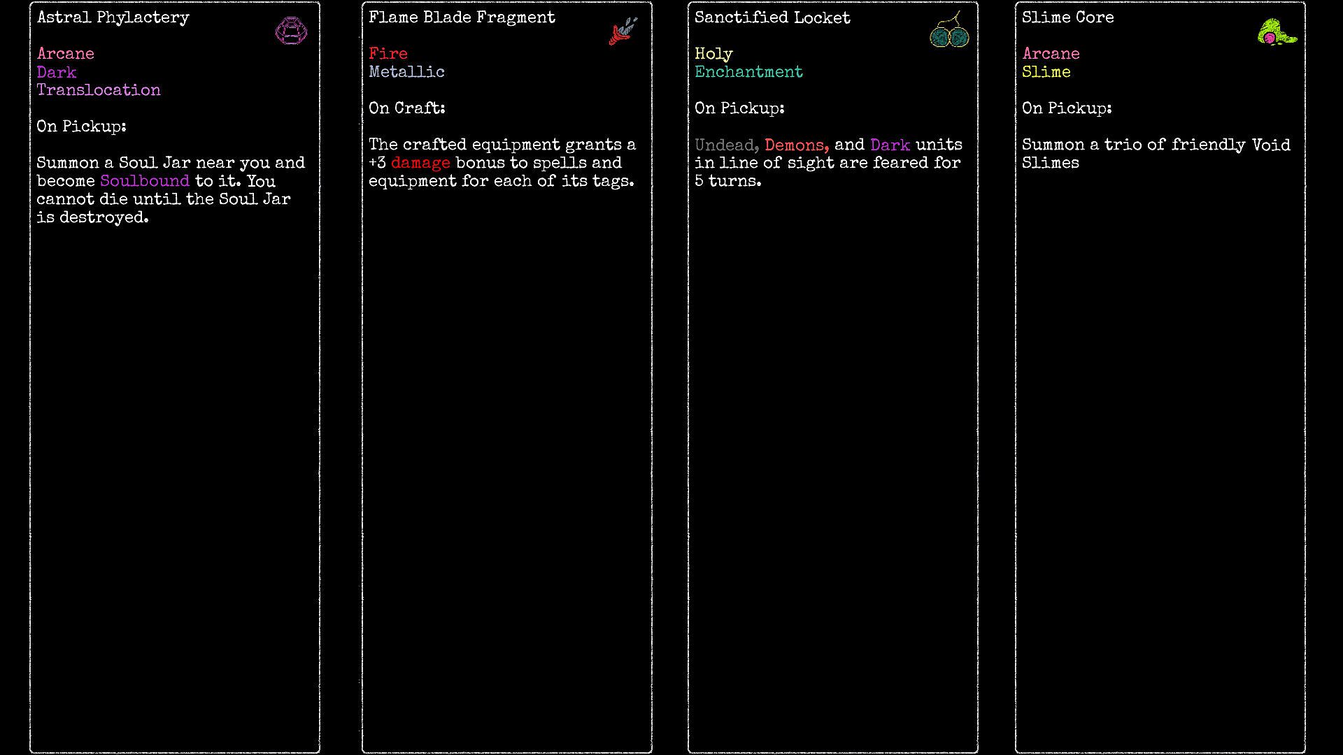 The craftable equipment has a wide variety of effects, ranging from stat bonuses to event triggers. Most passive skills and equipment from the previous games have been brought back in some form as craftable equipment, and more than a hundred new items have been added to the game. Make lightning fly out of your arcane damage, commandeer enemy spawners, give your demon summons fire breath, the possibilities are endless!