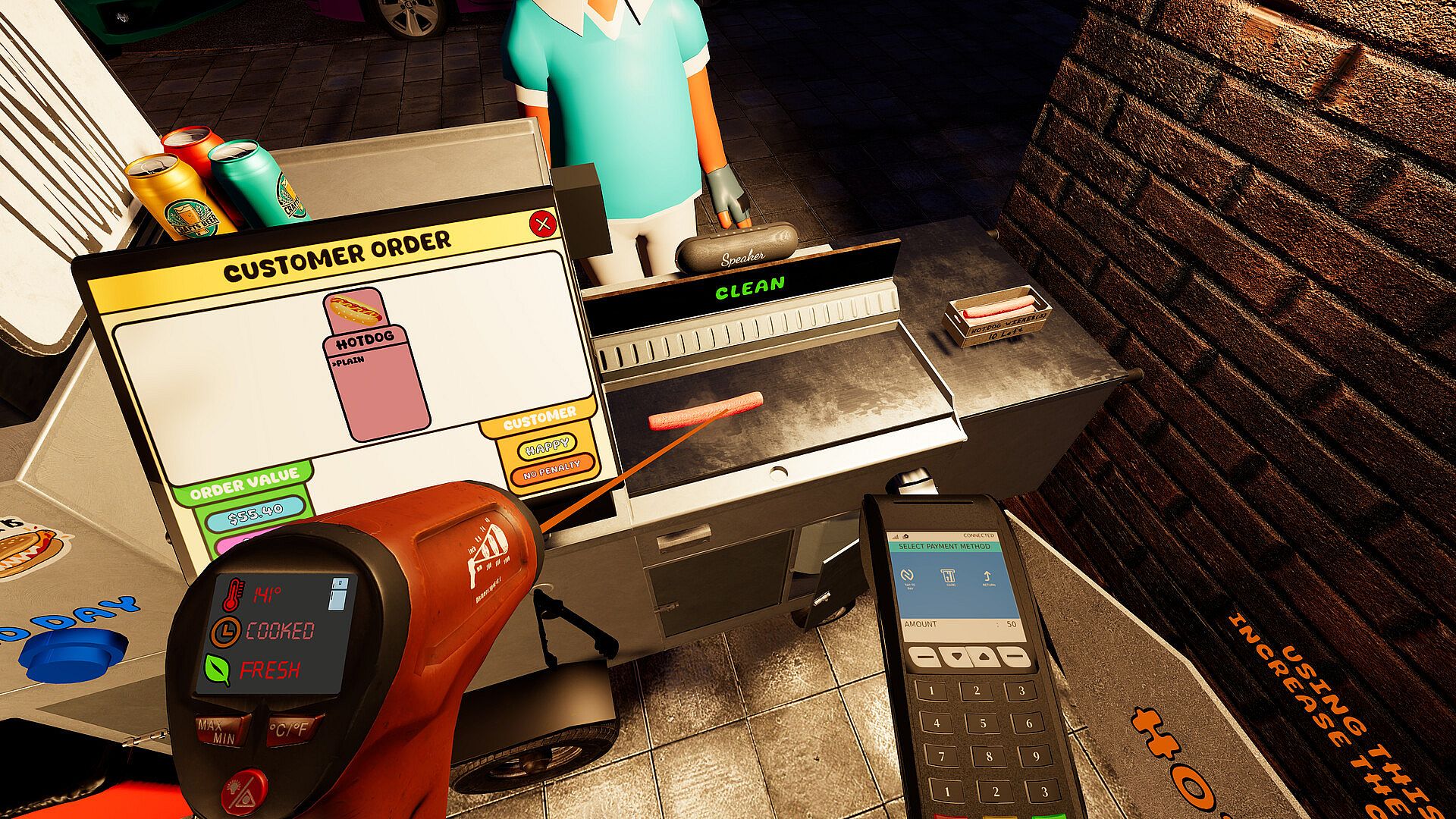 Your smartphone basically runs your whole operation. Order supplies, check your cash and level, switch trucks, hire workers, mess with settings, play games, check the weather, upgrade to the next business, or look up the guide, it's all there. You'll get notifications when something important happens during the day, including your end-of-day performance report and reputation changes. There's even a music app that plays through your in-game speaker. You can use the built-in tracks or throw your own music files in a custom folder if you want your own vibe going. Check the weather app to view tomorrow's forecast, so you can strategically choose your location and truck setup before the day starts, as certain locations have positives & negatives regarding the weather.