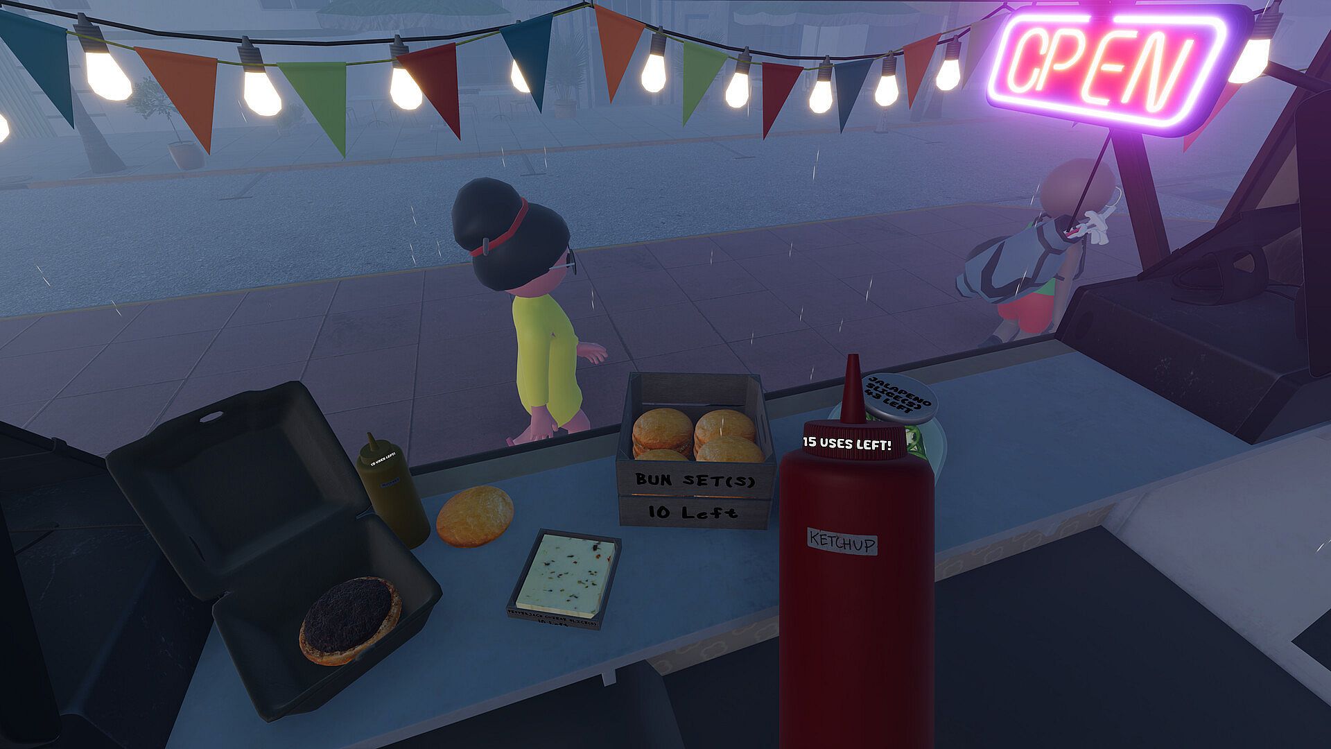 When you open up shop, the day starts. You'll see the sun move across the sky, evening roll in, and foot traffic slow down as it gets darker. Meanwhile, your customers are waiting and they're not infinitely patient. Take too long and they'll get upset, which means less XP and money when you finally serve them. The challenge ramps up too: hotdog stands let you serve one person at a time, trucks handle two orders simultaneously, and the restaurant? You're juggling five customers at once. During slow periods with no customers coming in, pull up the games app on your phone to waste time and stay entertained while you wait for the next rush.