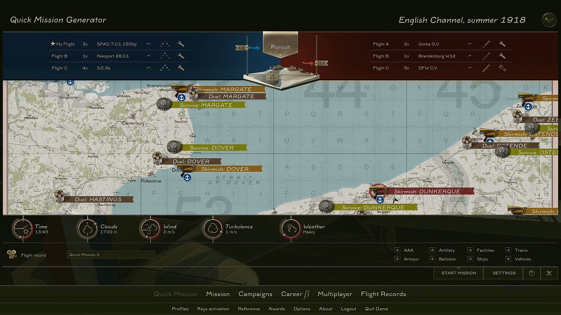- Pilot three fighter planes (Spad 13, Albatros D.Va and Nieuport 17 by Dux plant) with all their modifications included against any planes in the game.