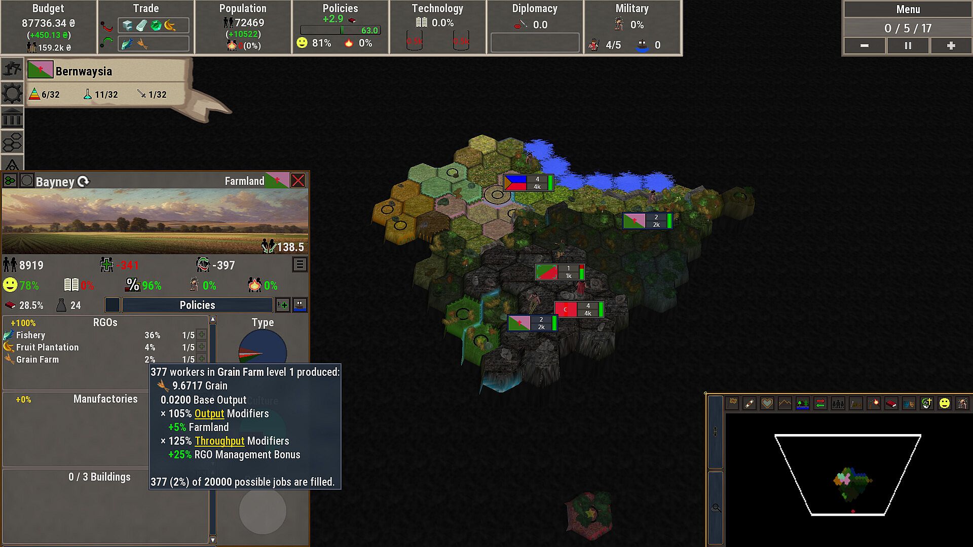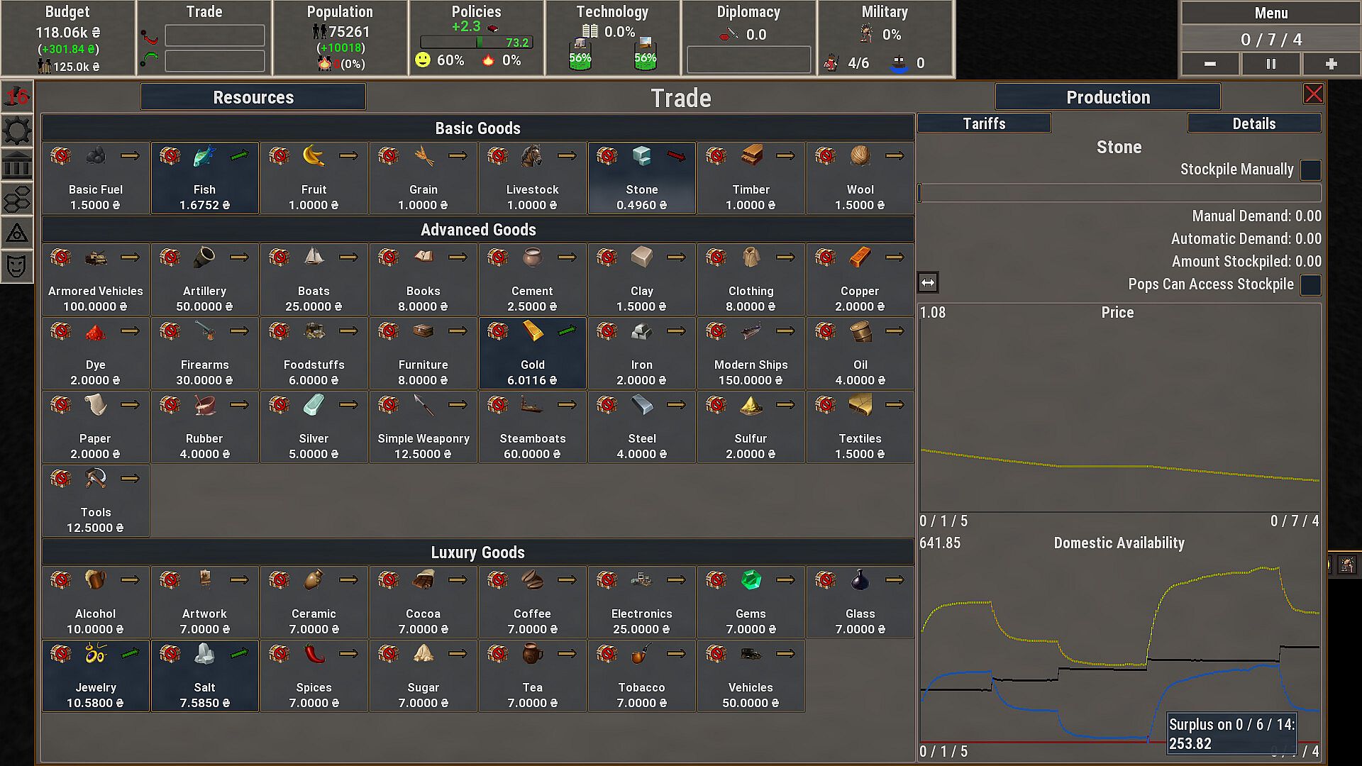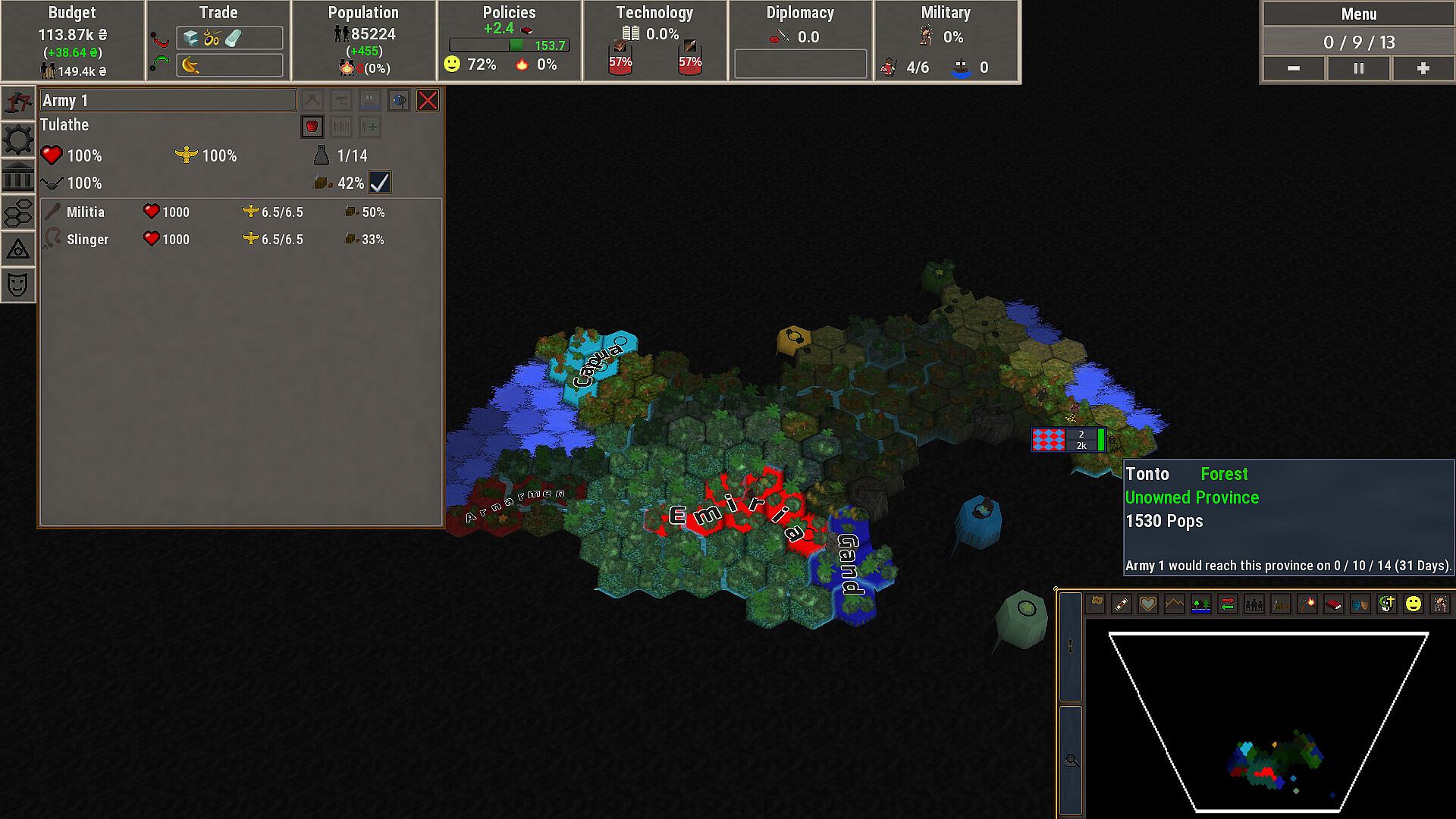 Rise of Hegemony features an in-depth economical system where every province contains a discrete number of people that all need resources to survive and thrive. Lacking access to sufficient amounts of critical goods such as food will cause your population to starve. Without access to weaponry your soldiers will be woefully unprepared to face enemies in battle. Trading with other countries is important, being dependant on them is perilous.
