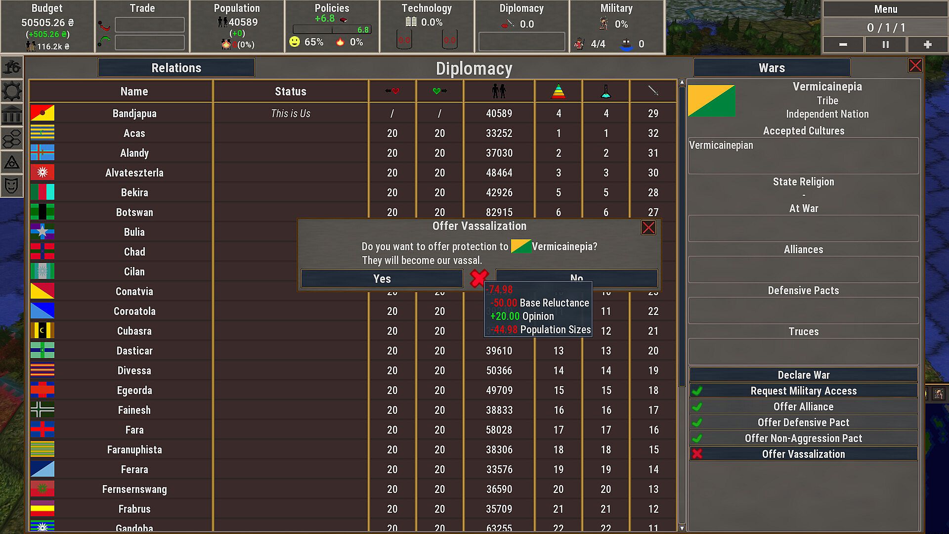 Starting as a fledgling country the way you want to conduct yourself on the world stage is up to you. Acting peacefully and benevolent has its benefits, but sometimes a more warlike approach is a quicker way to achieve your goals...