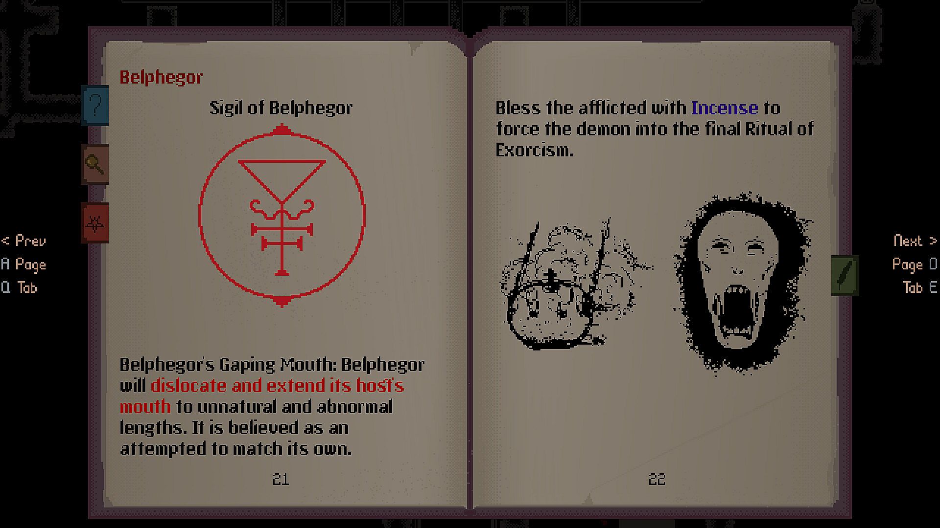 Your book contains information about all demons and demonic signs manifested by the possessed. Find the page that matches the current demonic sign and select the correct holy relic to counter the demon's actions.