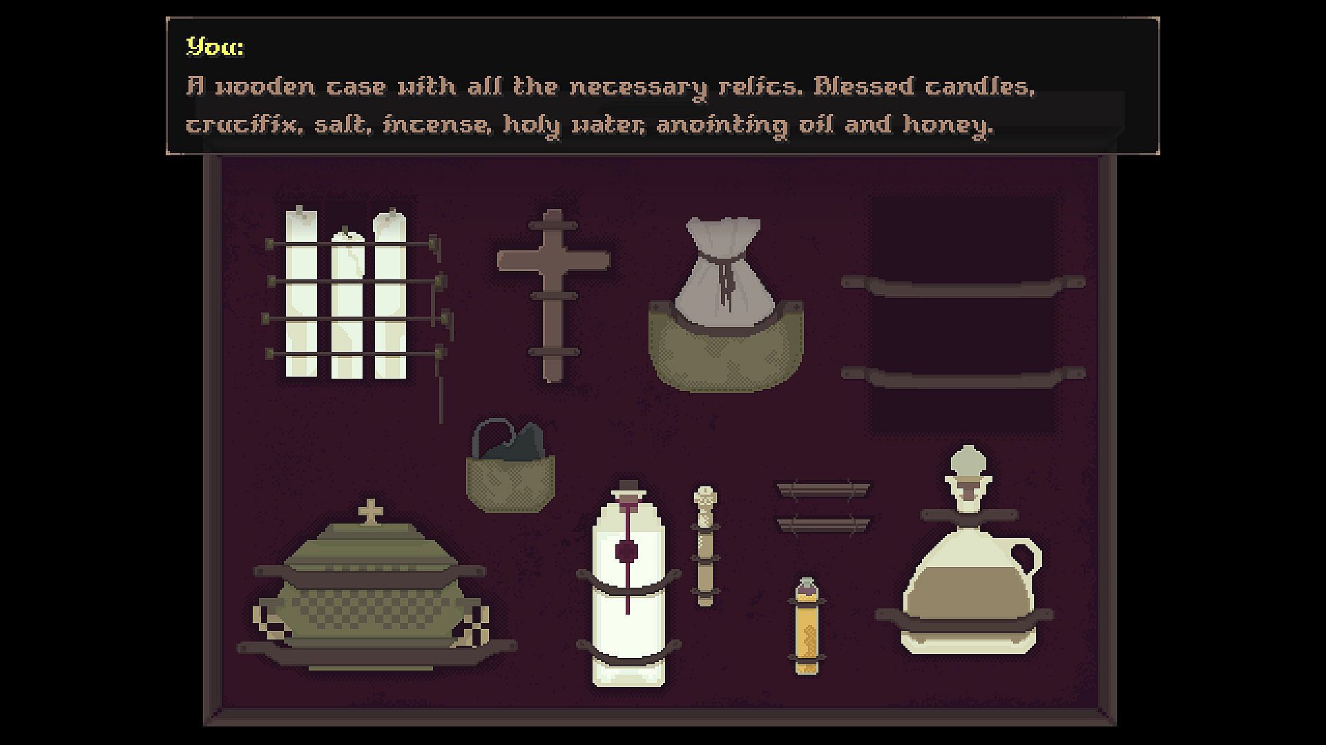 You will be equipped with six holy relics: Crucifix, blessed candles, holy water, anointing oil, incense and salt. Each relic has a unique minigame that you must complete to counter a demonic sign.