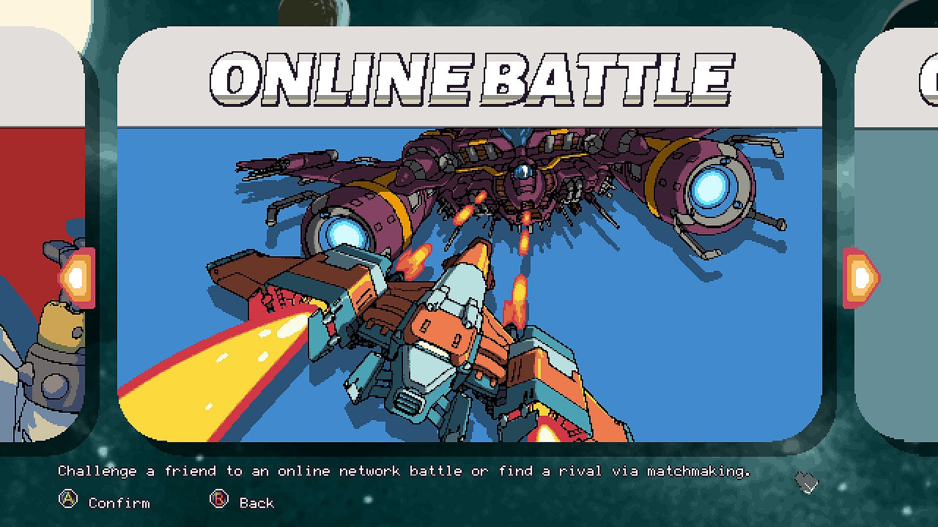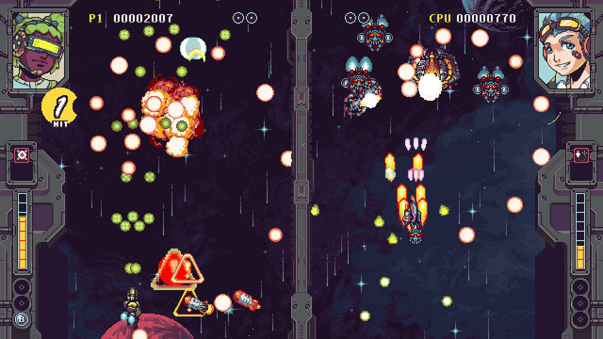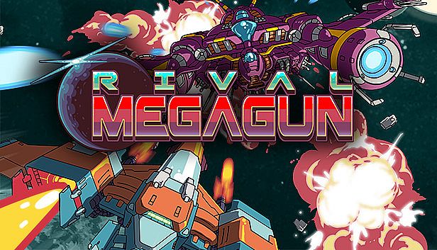 Rival Megagun is a competitive split-screen vertical shmup (or shoot 'em up, shooting game, STG) where you transform into a gigantic boss ship - your "Mega Gunship" - to invade your opponent's screen.