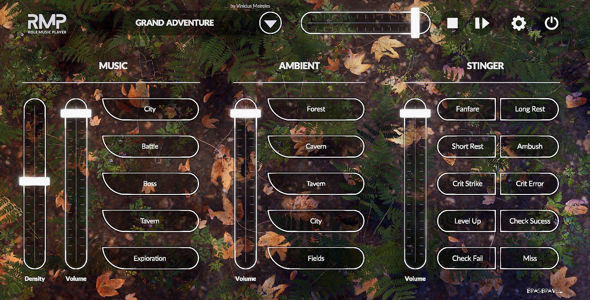 In the application it is possible to load different themed packages called “Dimensions”. Each one has 5 musical themes, 5 ambient sounds and 10 stingers (short sounds for pontual and important moments in the narrative). Every “Dimension” explores a specific subgenre that exists into a broader context like Dungeons and Dragons, Cyberpunk and Call of Cthulhu. All directed to the universe of Role Playing Games and to storytellers, our main public.